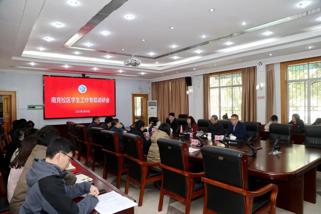 2月26日,学校党委副书记、校工会主席衡彤到南充校区调研指导学生工作。南充校区党委常务副书记方可,党委副书记、常务副校长姚远,党委副书记郝江岭,学校学工部、校团委、招就处负责同志参加调研。