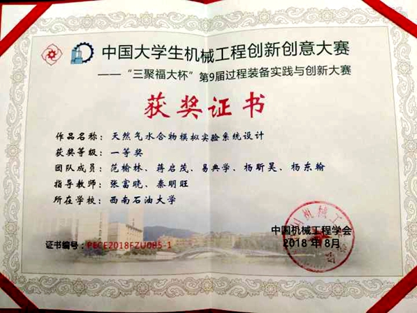工程学院学生杨东翰参加第九届全国大学生过程装备实践与创新大赛荣获全国一等奖