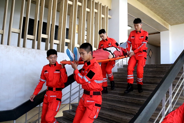 演练过程中模拟了学生受伤的情况。王胜军第一时间命令相关人员立即开展营救工作,在既紧张而又有条不紊的搜寻中,救援队终于找到了三位受困受伤的学生,应急处置小组第一时间给予了现场救援,并快速地将“伤员”通过担架等方式送至田径场医疗救助点进行救治。整个演练过程用时5分钟。演练过程中,同学们快速反应、有序撤离,被困同学正确呼救、科学防护,救援队伍迅速处置、成功营救,实现了演练的目标。