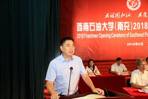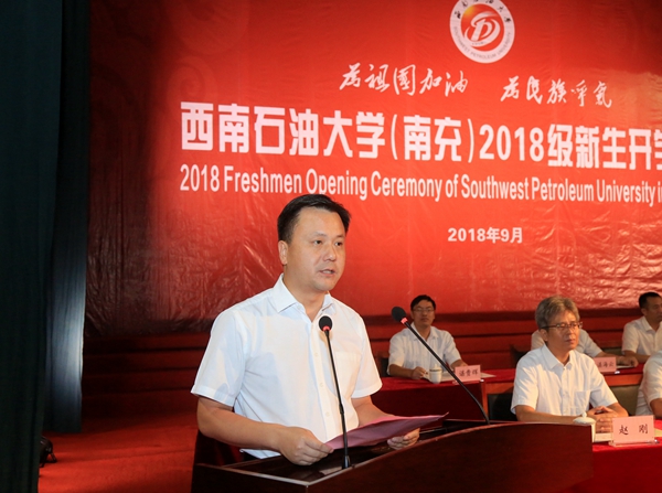 吴群刚在典礼上讲了话。他代表南充市委、市政府对2018级同学表示祝贺和欢迎。他说,西南石油大学优势突出、特色鲜明、实力强劲,已成功入选国家首批“双一流”建设高校。南充拥有2200年建城史,是四川省人口大市和经济大市,当前全市上下正全面落实省委十一届三次全会决策部署,全力建设“成渝第二城”、争创全省经济副中心,必将为同学们的学习、生活创造更加美好优良的环境支撑。