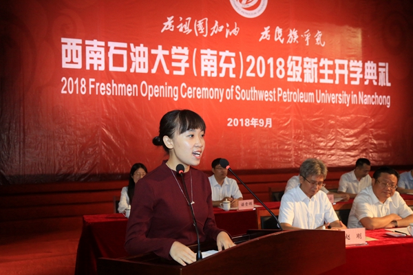 数字媒体技术专业2018级唐晓倩代表全体新生发言,表示将在西南石大的这片沃土,独立自强,学有所成。祝愿西南石大生日快乐,家乡南充越来越好。
