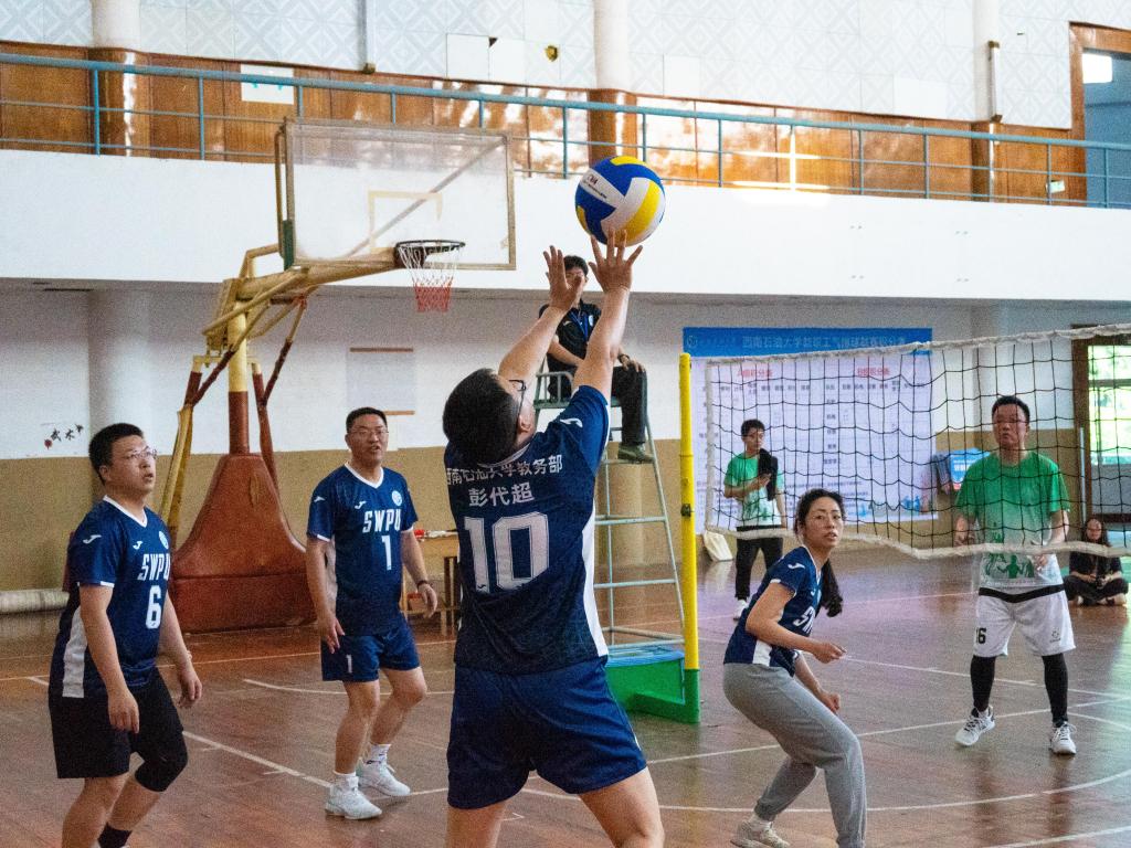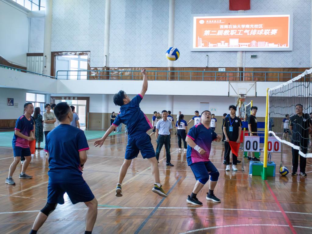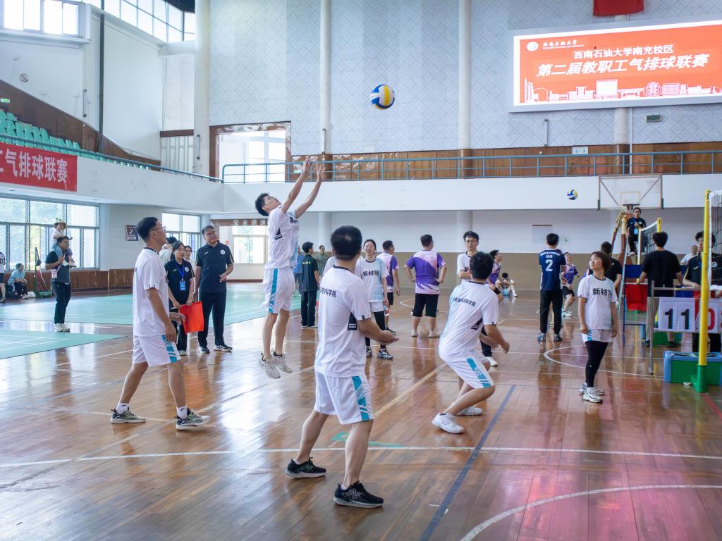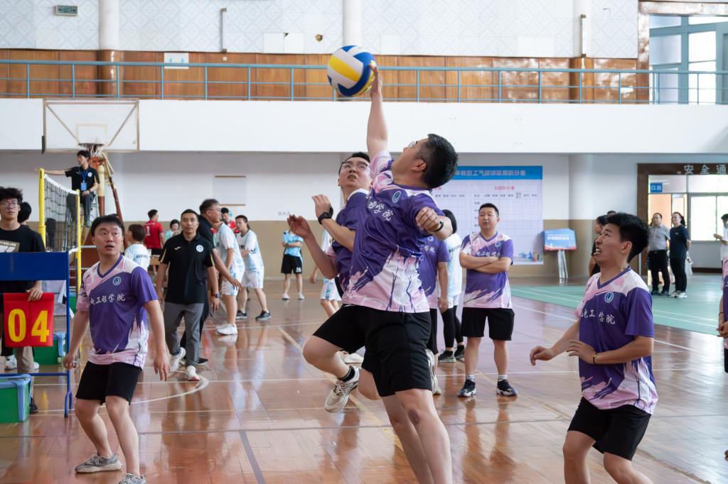 在清脆的哨声之后,各代表队展开激烈角逐。发球者弓步蓄力,排球如箭离弦;接球者飞身扑救,稳稳将球垫起;扣球者高高跃起,手臂猛挥,排球似流星砸向对方场地。双方你来我往,精彩不断,尽显拼搏风采,场下观众激情四射,呐喊助威,教职工们用精湛技艺与默契配合诠释着竞技体育的魅力。