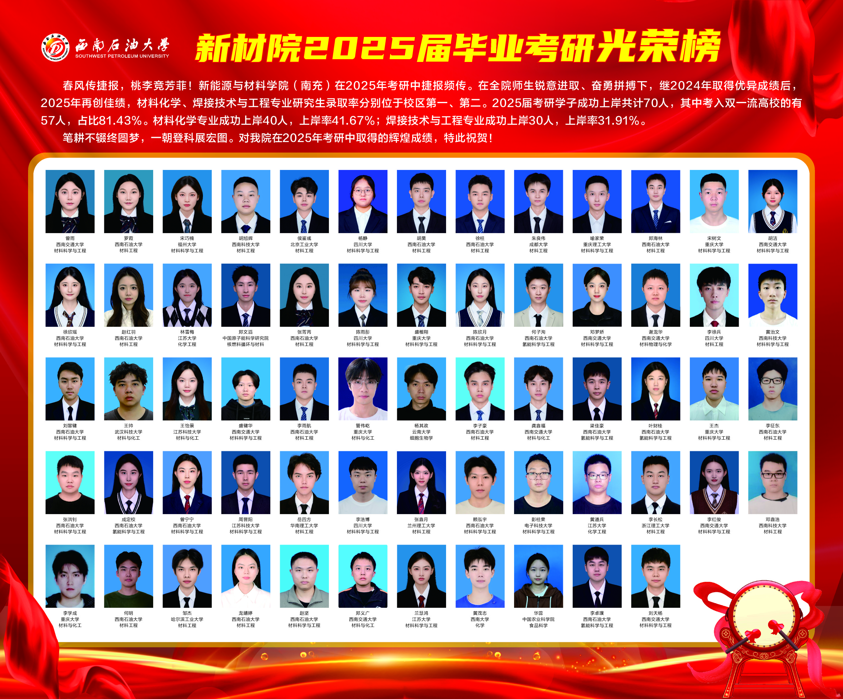 在学院“方舟”的庇护下,包括这两个寝室在内,新能源与材料学院在南充校区的2025 届学生考研上岸成绩亮眼:190名毕业生中,其中,材料化学专业 96 人,研究生拟录取人数40 人,上岸率 41.67%,位于南充校区所有专业第一;焊接技术与工程专业 94 人,研究生拟录取人数 30 人,上岸率 31.94%,位于南充校区所有专业第二。