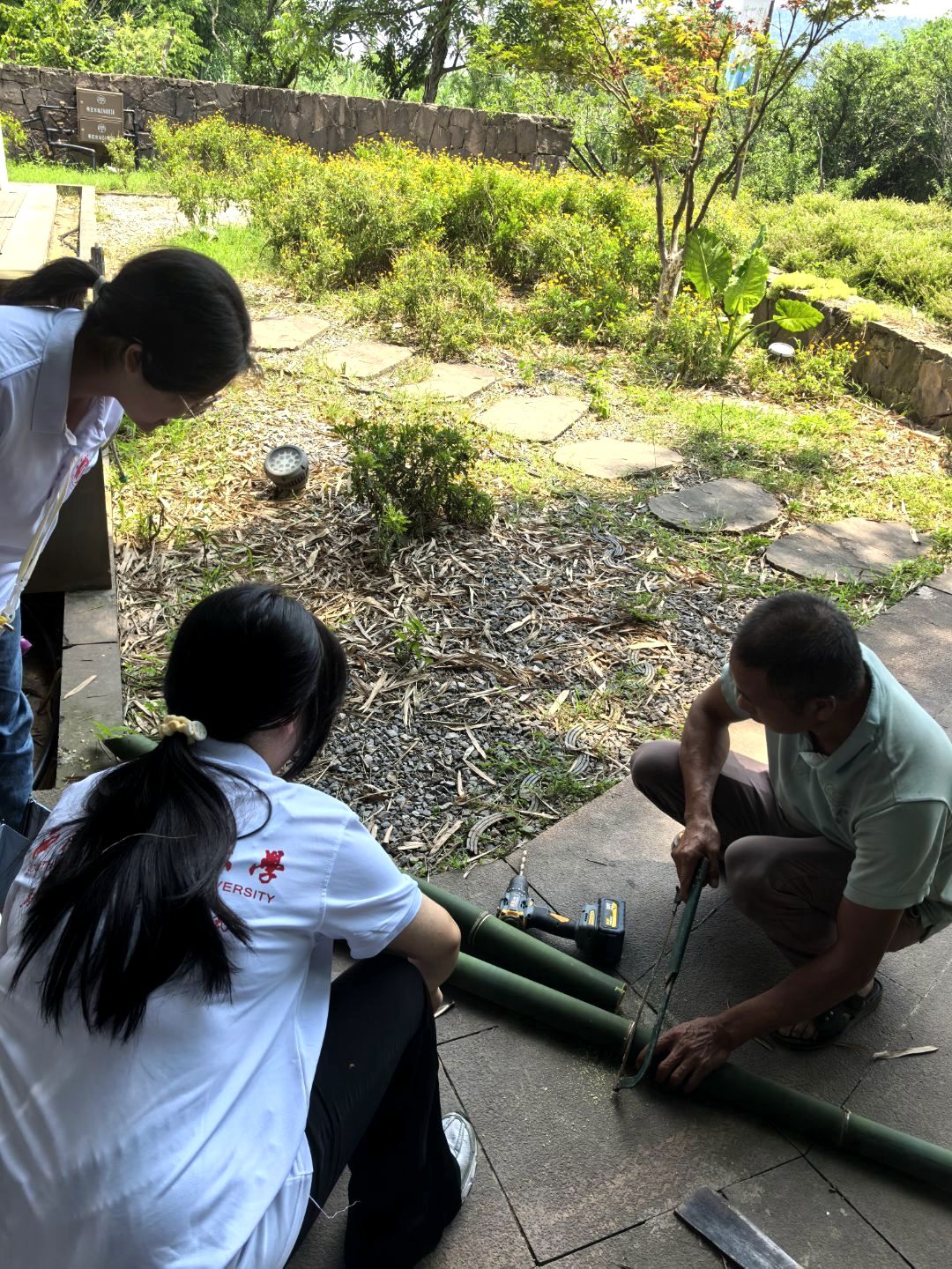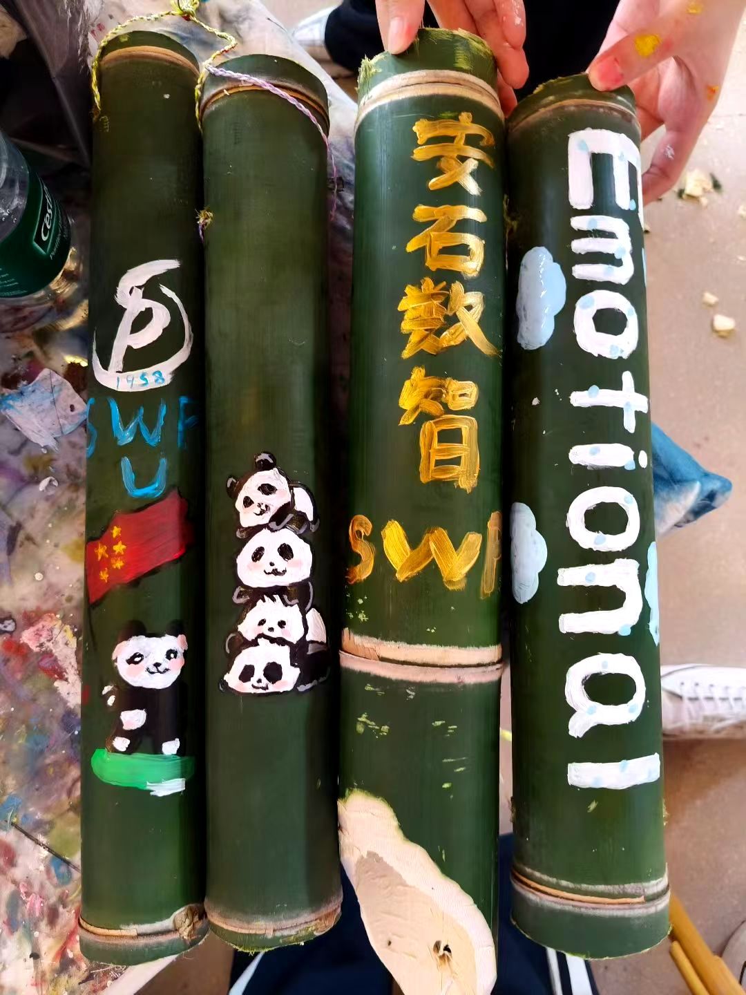 说干就干。7月8日清晨,队员们跟着村民雷得令钻进毛竹林,选竹、砍竹、锯段、钻孔,再用颜料、麻绳装饰,一个个绘有“SWPU”(西南石油大学英文简写)和 “情绪” 标志的竹筒制成,成了“情绪储蓄罐”。