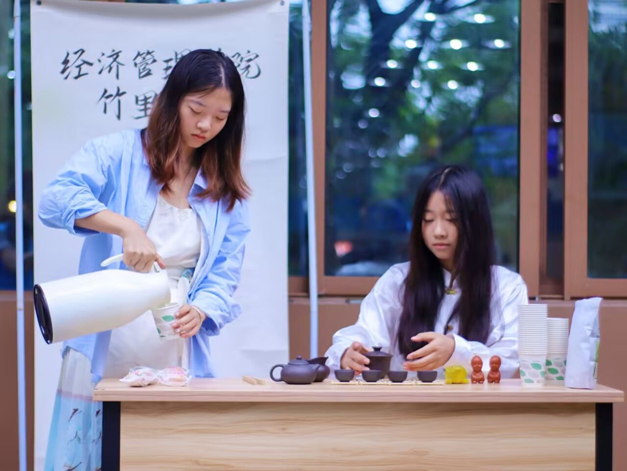 经管院在龙井雅苑食堂门口设立茶艺展示点,在传递中华优秀传统文化的同时,也为远道而来的新生与家长奉上一杯杯清心解暑的茶饮,于细微处传递学院的人文关怀。“不少家长和同学尝过之后都连连称赞!”经管院学生志愿者高兴地说道。