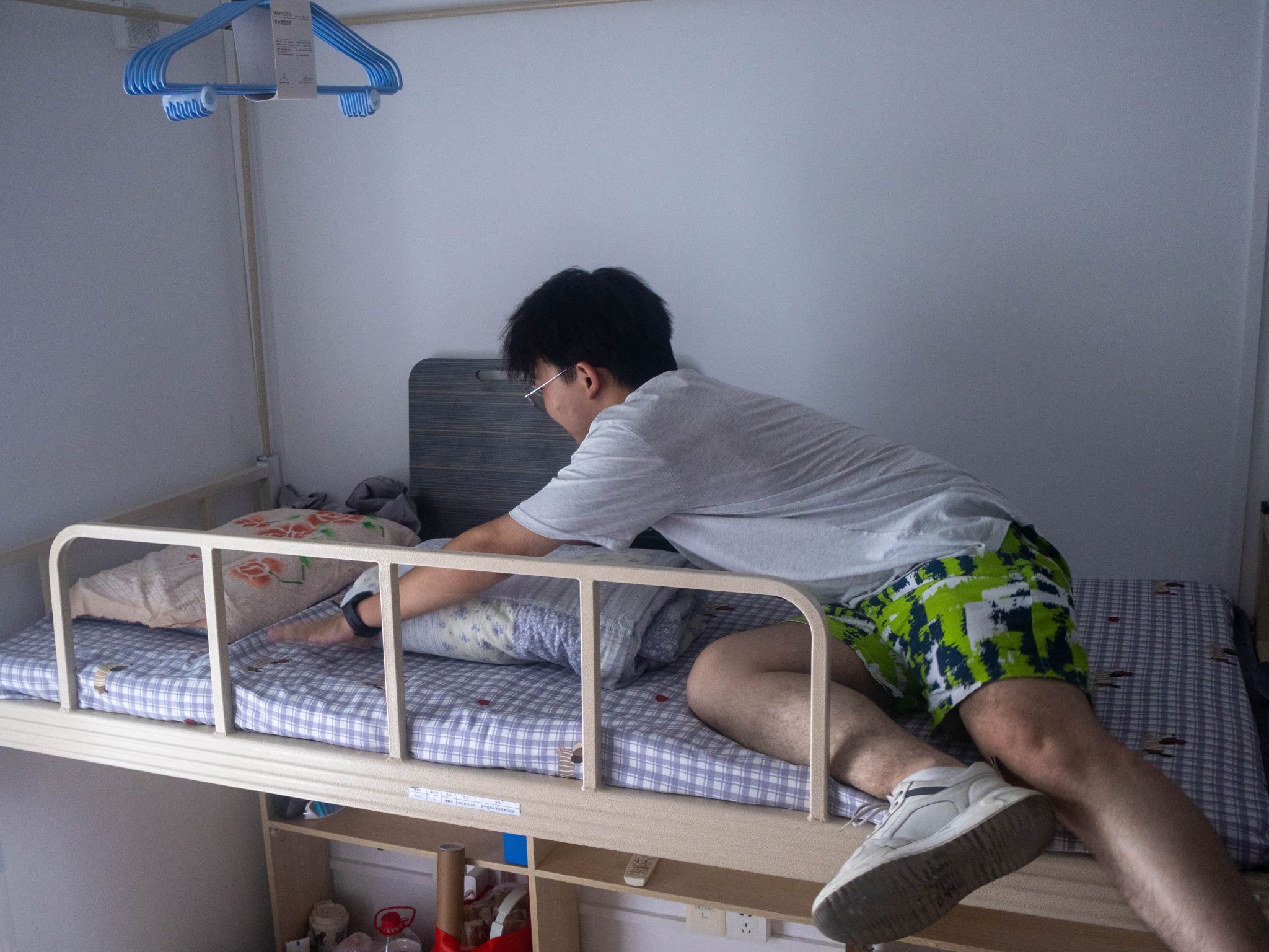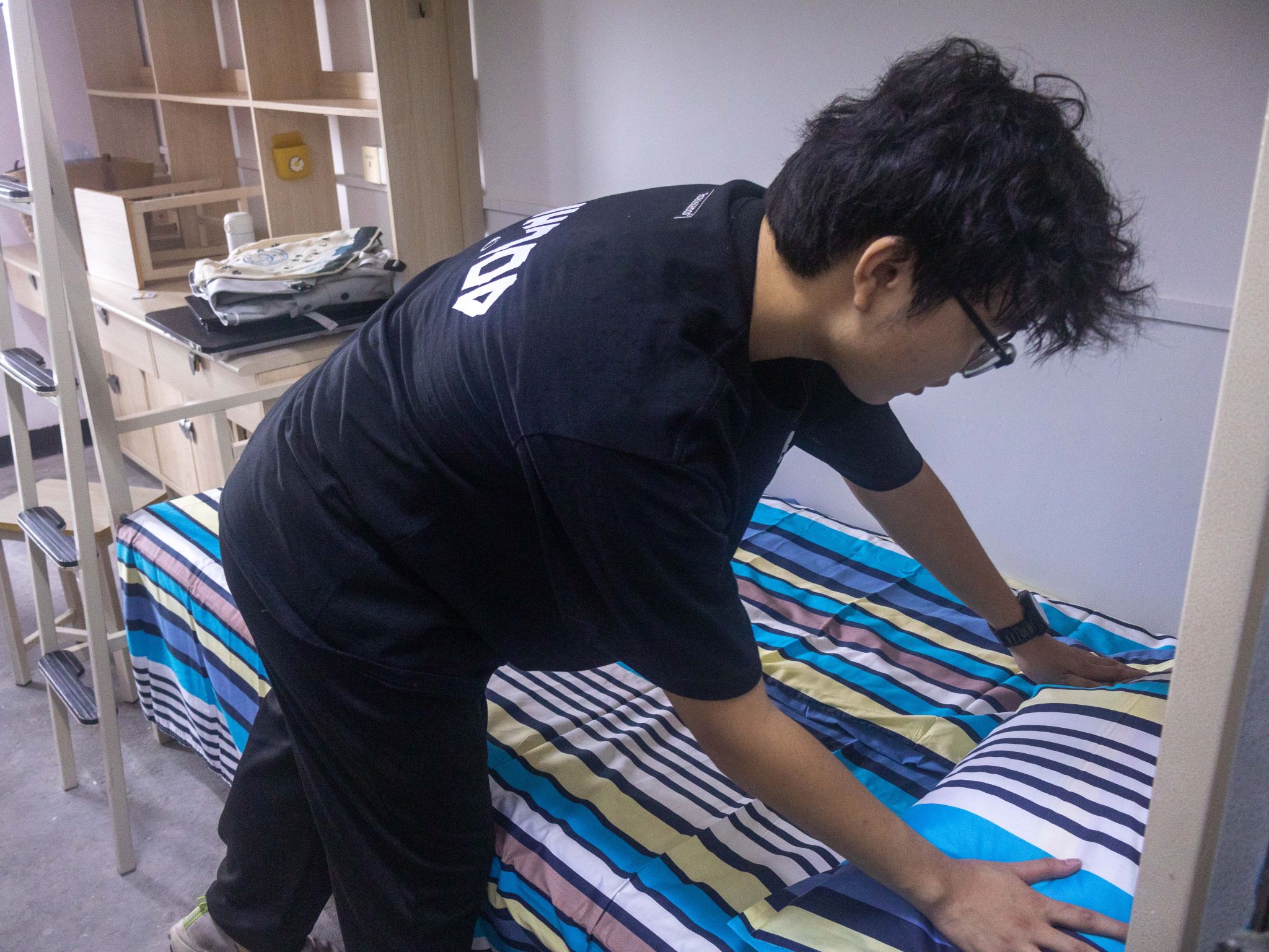 唐畅言与彭运分别在各自寝室整理内务
