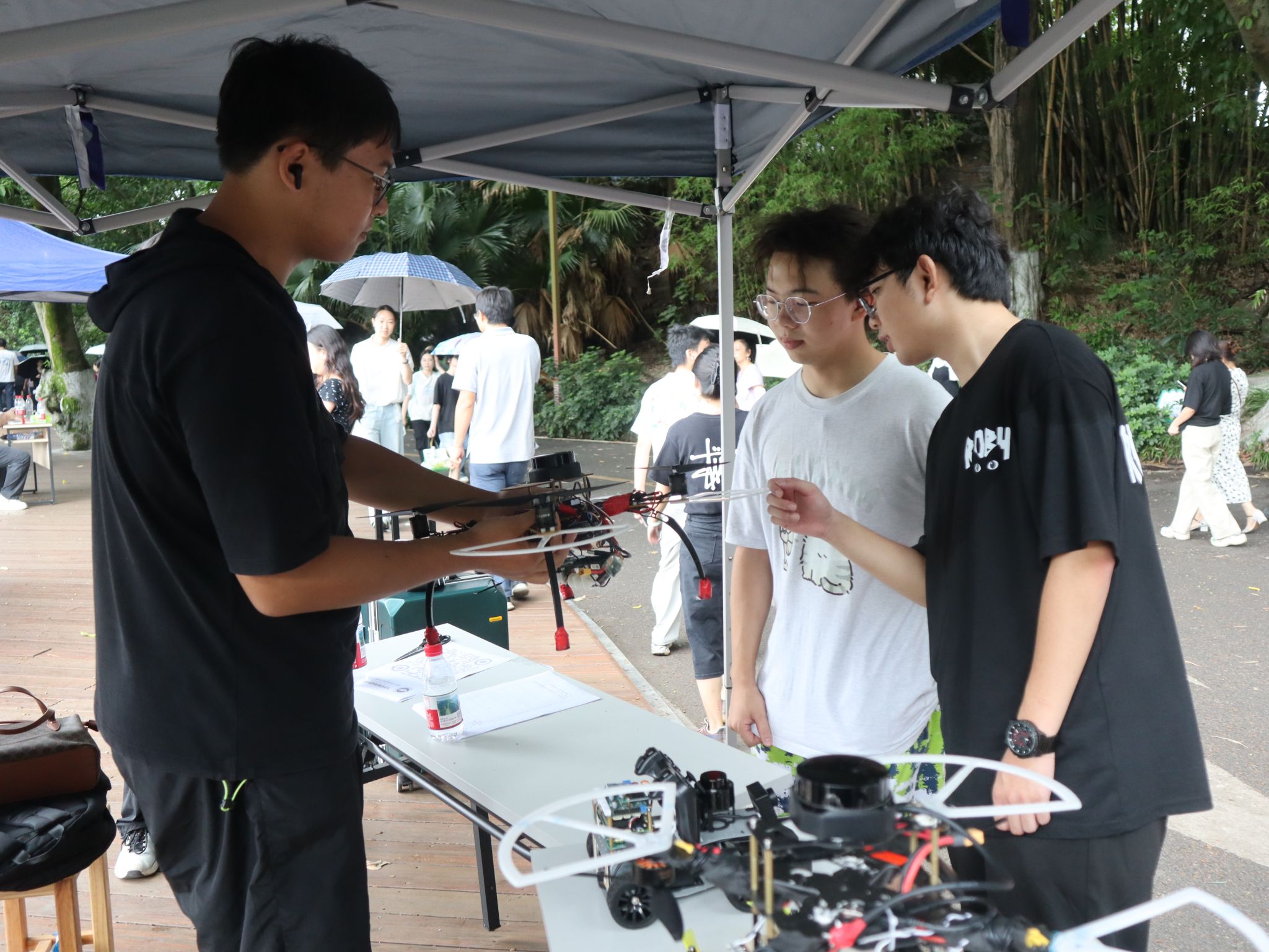 唐畅言与彭运在校园里观看科技展