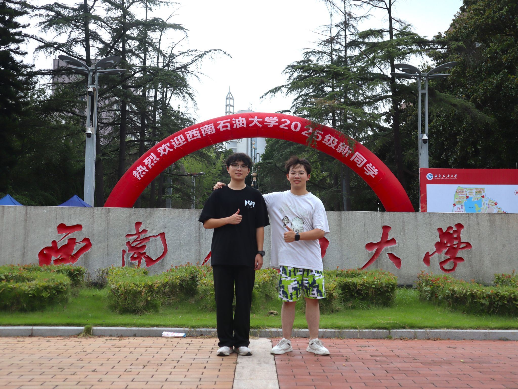 唐畅言和彭运在南充校区校门口合影