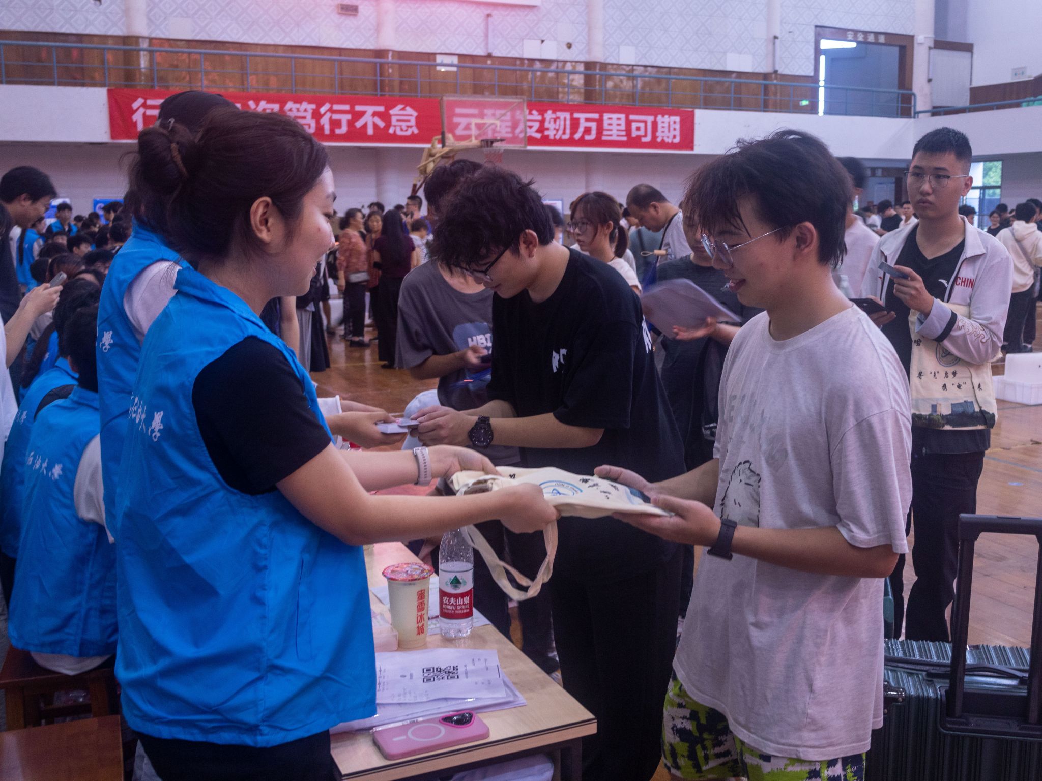 唐畅言与彭运新生报到注册联合办公区办理入学手续