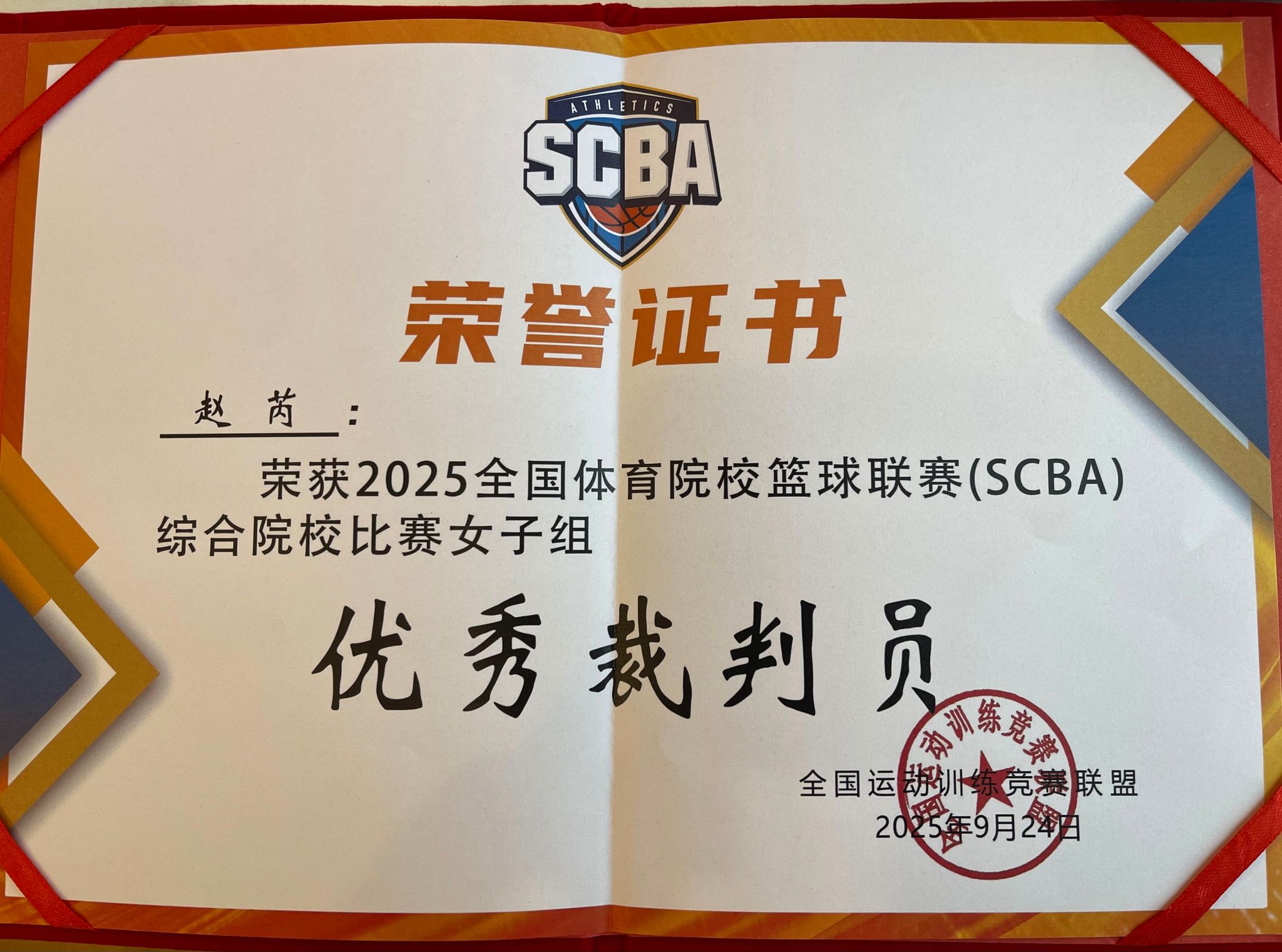 本次比赛全国共选派32名技术官员。其中,国家级裁判员23名,赵芮老师共执裁9场比赛,包括开幕式揭幕战、决赛等,并荣获2025全国体育院校篮球联赛优秀裁判员称号。