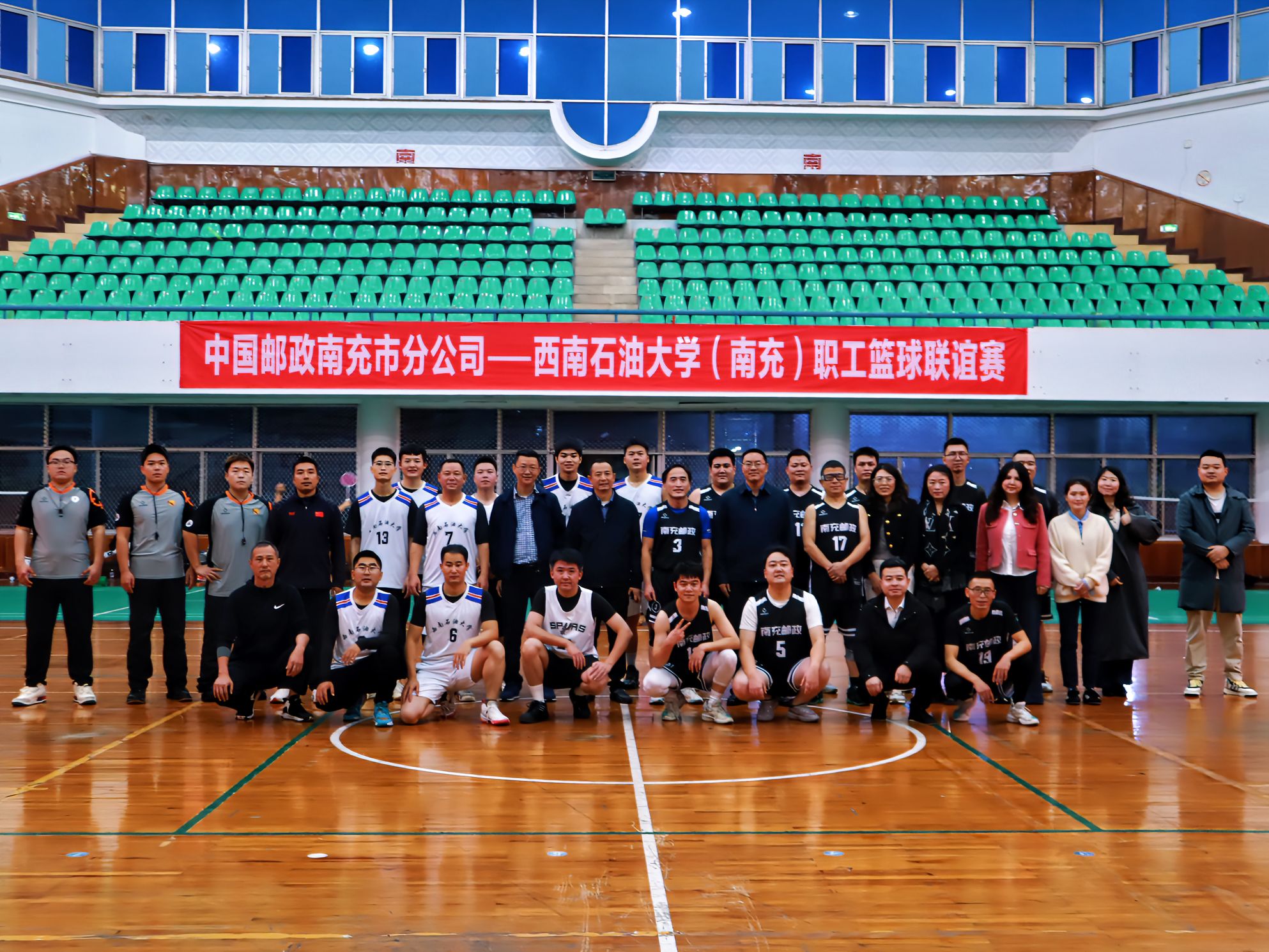 10月30日下午,南充校区体育馆内气氛热烈,校区教职工篮协与中国邮政南充市分公司职工篮球队举办了“石邮杯”职工篮球友谊赛。南充校区党委副书记、常务副校长覃鸿飞、副校长谌贵辉、南充市邮政分公司副总经理朱旭现场观摩比赛,为双方队员加油鼓劲。南充校区副校长李平、南充市邮政分公司副总经理姜茂林与双方队员共同投身赛场。