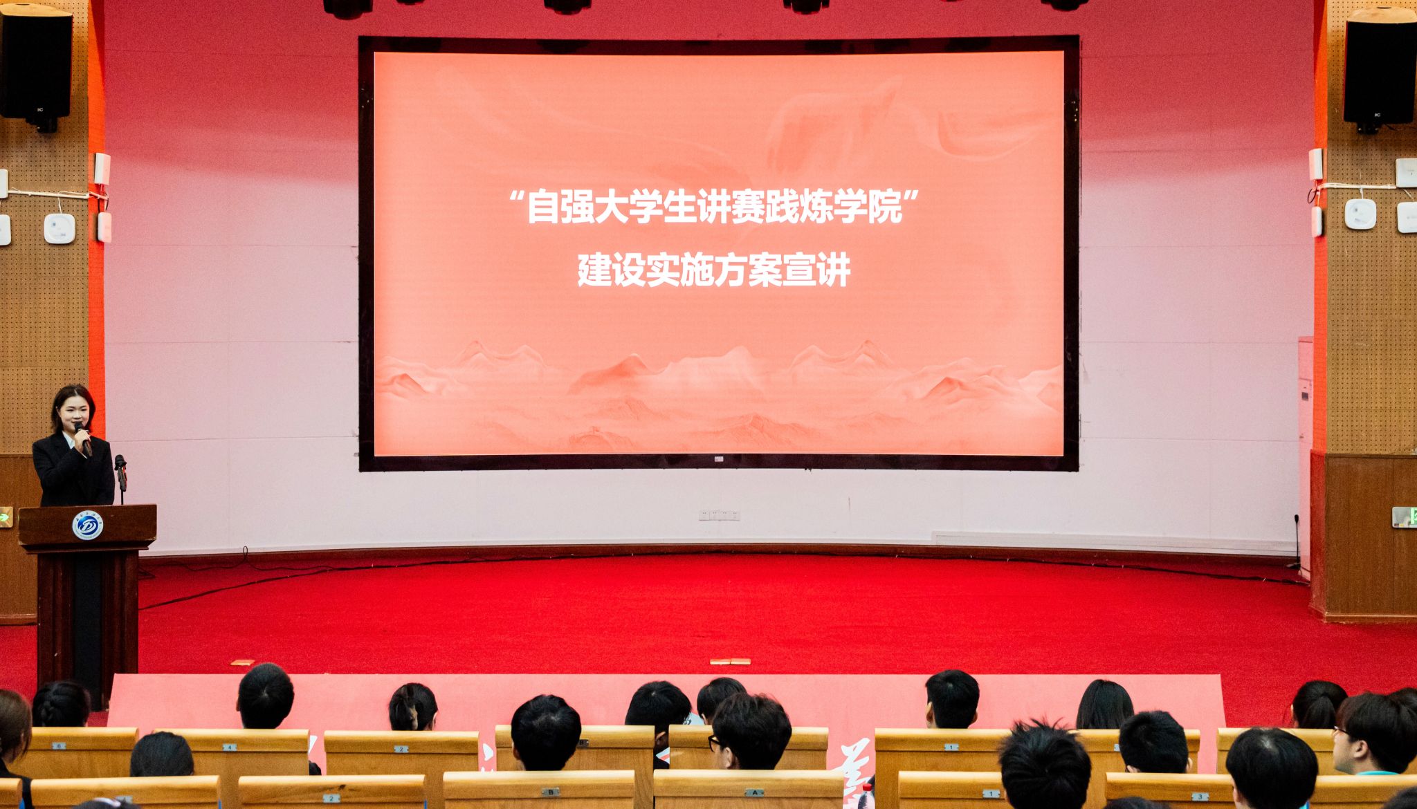 学生发展部(团委)副部长秦明旺为“自强大学生讲赛践炼学院”学生团队及新一届“一站式”学生社区民主管理委员会成员颁发聘书。学生发展部(团委)团学工作中心主任王治平详细解读了《“自强大学生讲赛践炼学院”建设实施方案》。