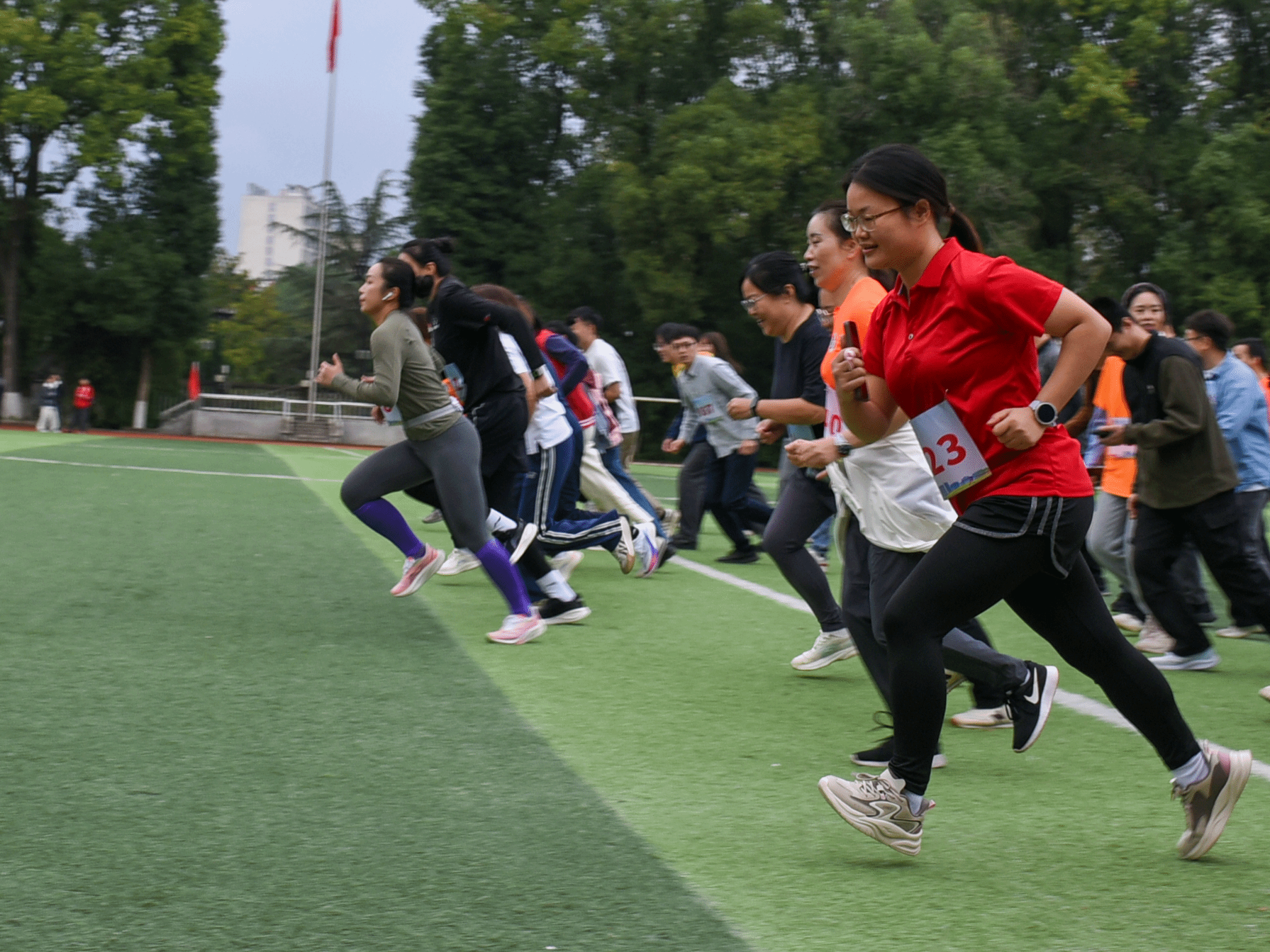随着发令枪响,参赛师生如离弦之箭冲出起点,一场健康拉力赛正式拉开帷幕。赛道上,既有教职工稳健的步伐,也有学生青春的飞驰,每一步都在丈量历史的厚度,每一滴汗水都在浇灌精神的传承。奔跑过程中,参赛者们彼此鼓励,沿途的师生们热情加油,掌声连绵不绝。终点处,冲刺的身影与绽放的笑容交织成一幅动人的画面。