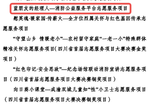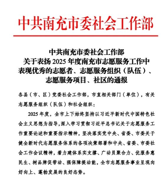 12月2日,中共南充市委社会工作部发布文件,对2025年度南充市志愿服务工作中表现突出的志愿者、志愿服务组织(队伍)、志愿服务项目及社区进行了通报表彰。南充校区青年志愿者协会申报的“蓝朋友的经理人——消防公益服务平台志愿服务项目”光荣上榜,荣获“优秀志愿服务项目”称号。
