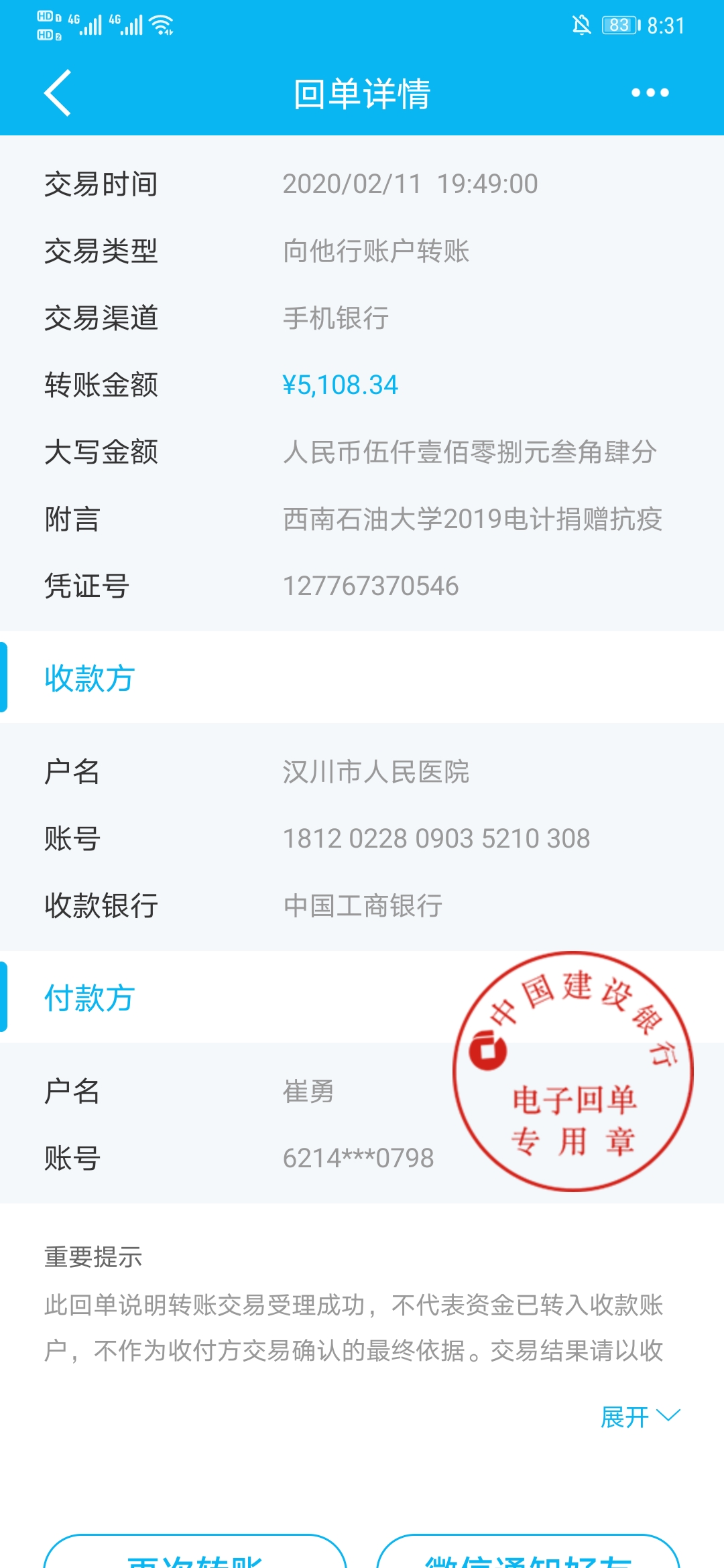 近日,信息学院2019级电子与计算机工程专业的同学,积极响应学校新冠肺炎疫情防控领导小组动员师生积极筹措防疫物资的号召,迅速动起来,自发组织本专业同学积极向武汉大学人民医院汉川医院定向捐款4408.34元,辅导员崔勇老师捐款700元,以实际行动助力疫情防控。