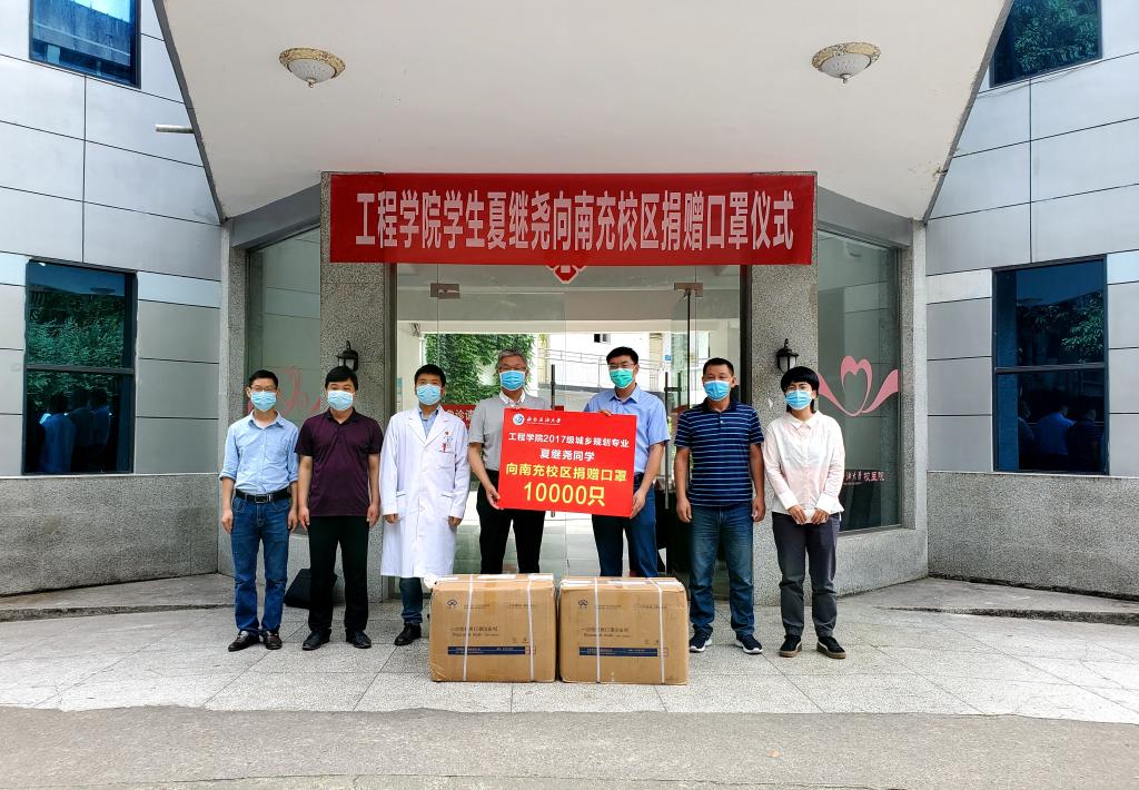 5月27日下午,工程学院城乡规划专业2017级学生夏继尧,向南充校区捐赠1万只口罩,助力校区疫情防控。南充校区副校长王胜军代表校区接受了捐赠。南充校区学生工作部(团委)部长郝江岭、总务部部长李平、工程学院院长谌贵辉,学生工作部(团委)、工程学院、校医院有关同志参加捐赠仪式。