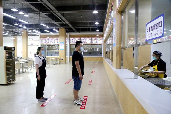 在学生食堂外设置有洗手区,工作人员现场引导,“同学们”按照不少于1米的间距有序排队,佩戴好口罩并清洗双手。在食堂入口处经体温检测正常后,按照导向标识进入食堂,在窗口等候线有序排队点餐。工作人员提醒“同学们”不扎堆、不闲谈,尽量自带餐具点餐或打包带走不逗留,如确需在餐厅内就餐,须一人一桌同向单独用餐。就餐结束后,同学们由指定通道离开食堂。