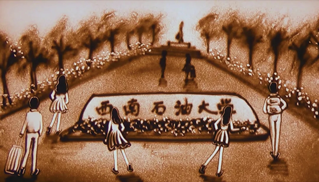 歌会期间,一幅沙画《六十二载,石大共芳华》映入眼帘。以第一人称的视角,讲述了一名石大在校生的丰富求学历程。