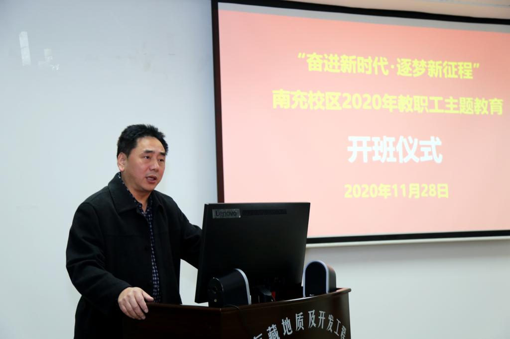 11月28日上午,南充校区2020年“奋进新时代 逐梦新征程”主题教育开班仪式在学校油气藏国家重点实验室报告厅举行。赵刚主持仪式,张光君出席仪式并作动员讲话。