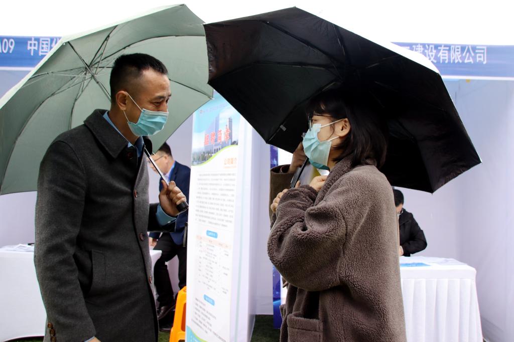 细雨绵绵,求职学生热情丝毫未减。同学们早早就来到会场手捧精心准备的简历,在用人单位信息公告栏上认真地寻找着自己心仪的就业岗位。他们信心满满,主动向用人单位代表介绍和推荐自己,询问负责人关于应聘条件、企业运营管理、未来发展前景等情况,有的同学还积极让本专业老师为自己求职进行现场指导。