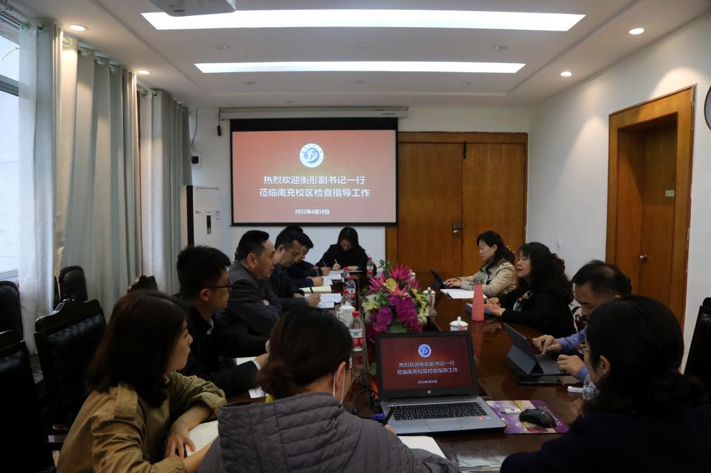 4月19日,学校党委副书记衡彤一行莅临南充校区检查指导工作,与校长助理、南充校区党委常务副书记张光君,南充校区党委副书记、纪委书记覃鸿飞座谈。学校招生就业处处长张敏,心理发展与服务中心主任方可,校区学生工作部(团委)有关同志、各学院分管学生工作负责人参加会议。