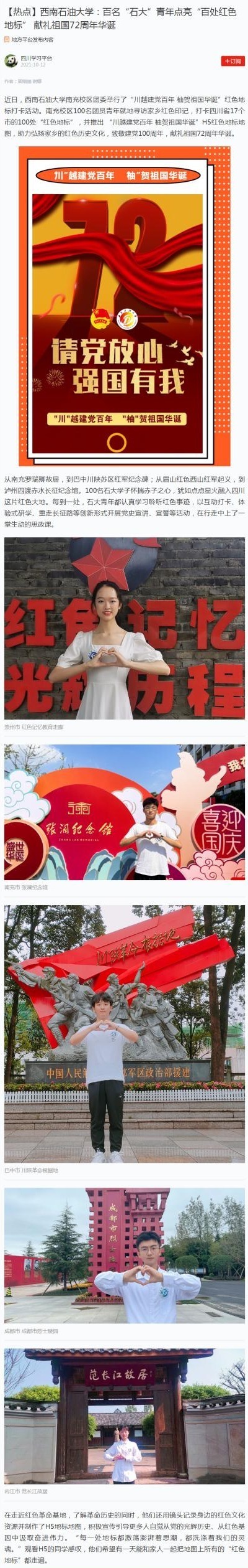 近日,西南石油大学南充校区团委举行了“川越建党百年 柚贺祖国华诞”红色地标打卡活动。南充校区100名团员青年就地寻访家乡红色印记,打卡四川省17个市的100处“红色地标”,并推出 “川越建党百年 柚贺祖国华诞”H5红色地标地图,助力弘扬家乡的红色历史文化,致敬建党100周年,献礼祖国72年华诞。