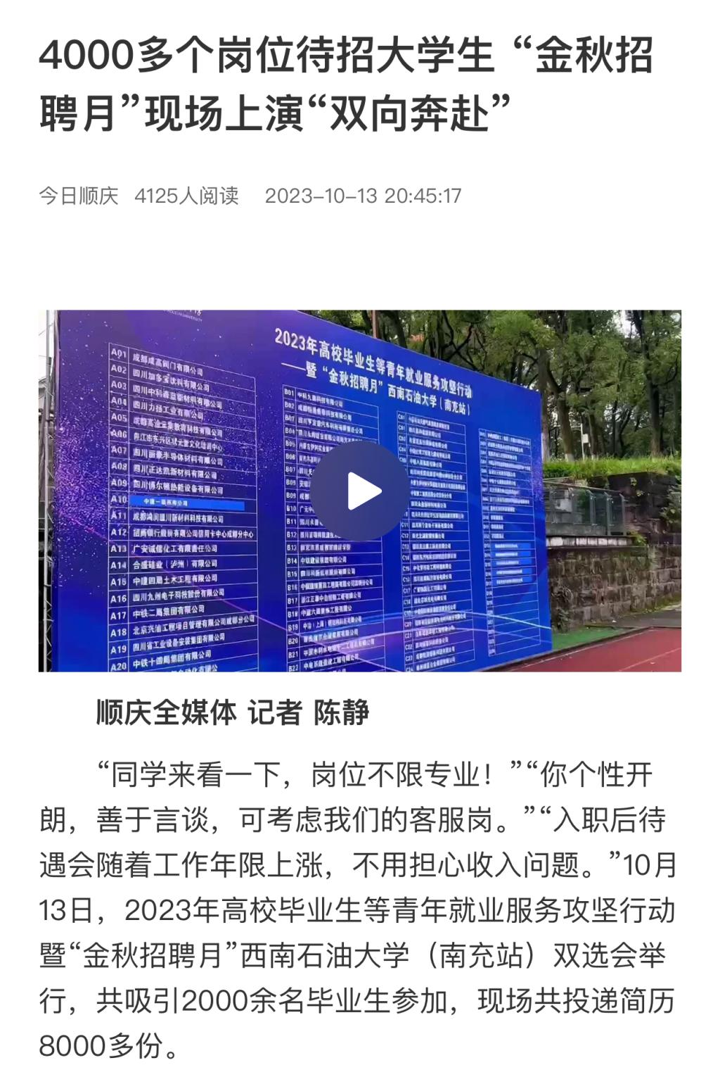 南充日报以《学姐带近300个岗位回母校“金秋招聘月”上演“双向奔赴”》为题开展了相关报道。今日顺庆以《4000多个岗位待招大学生“金秋招聘月”现场上演“双向奔赴”》为题开展了相关报道。封面新闻以《四川南充启动“金秋招聘月”,120家企业一共4000多个就业岗位》为题开展了相关报道。