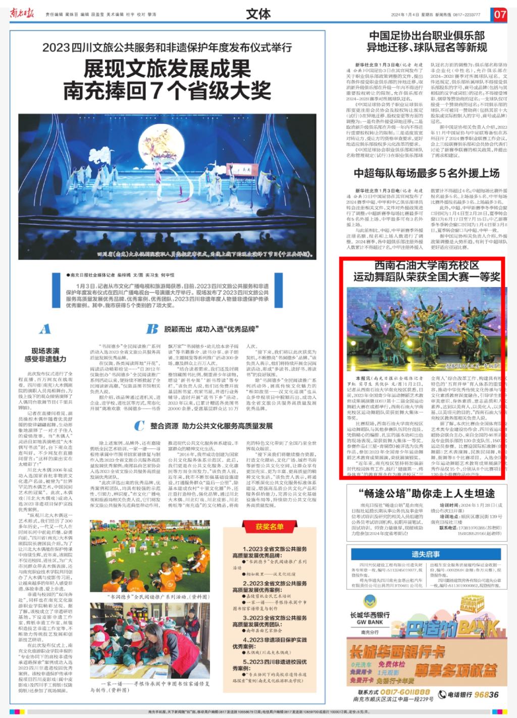 1月4日,南充日报以《西南石油大学南充校区运动舞蹈队荣获全国大赛一等奖》为题开展了相关报道。