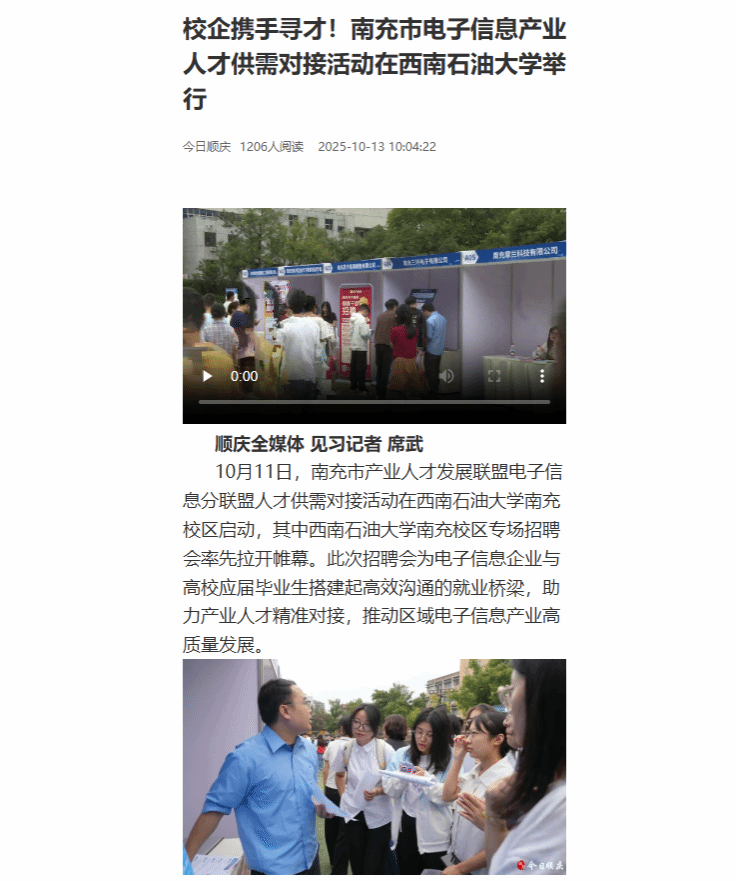 10月13日,今日顺庆以《校企携手寻才!南充市电子信息产业人才供需对接活动在西南石油大学举行》为题进行了相关报道。