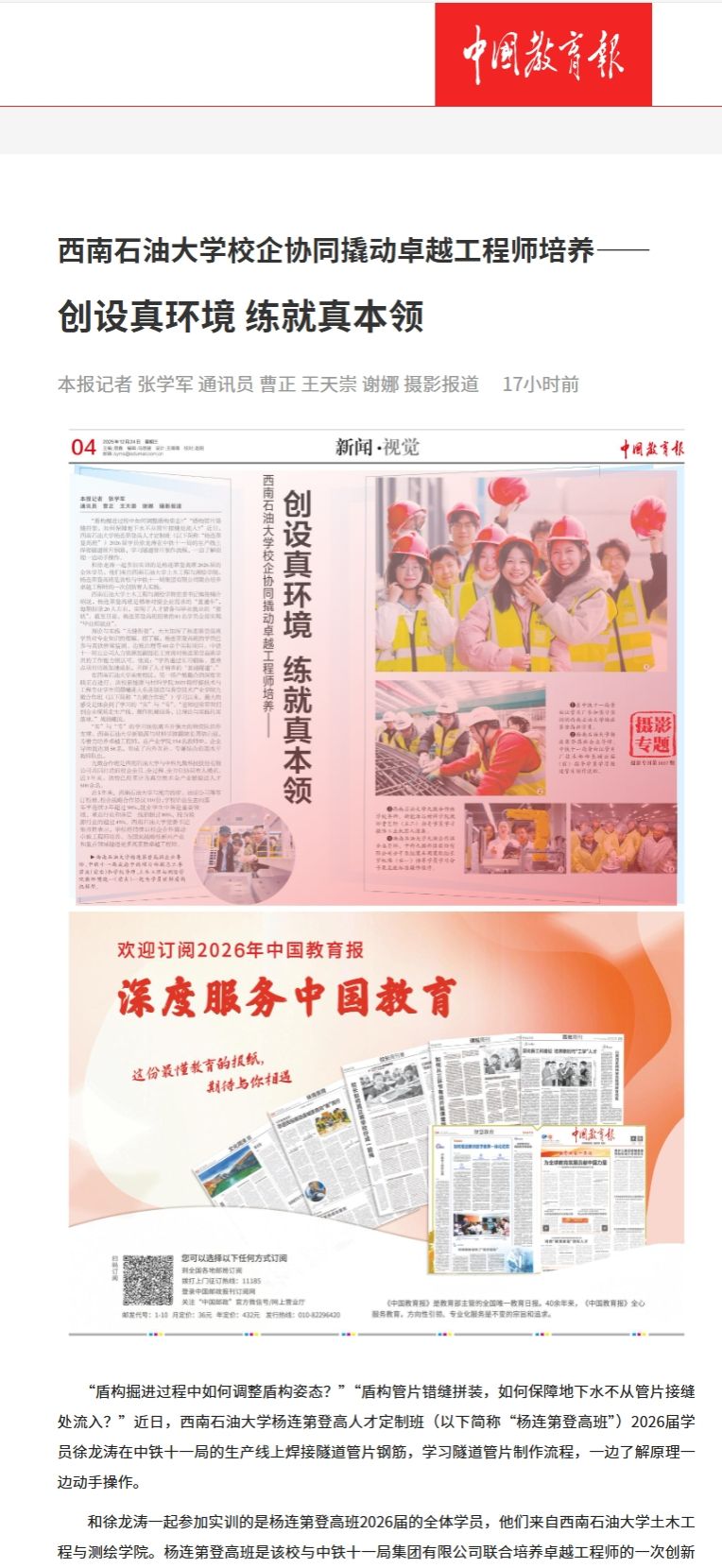 12月24日,中国教育报以《西南石油大学校企协同撬动卓越工程师培养—— 创设真环境 练就真本领》为题进行了相关报道。
