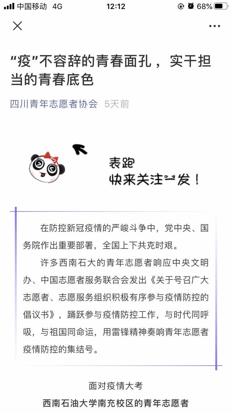 3月27日,中国青年志愿者协会官方微信公众号、四川青年志愿者协会官方微信公众号以《“疫”不容辞的青春面孔 ,实干担当的青春底色》为题,重点报道了南充校区青年大学生参加家乡疫情防控志愿服务。