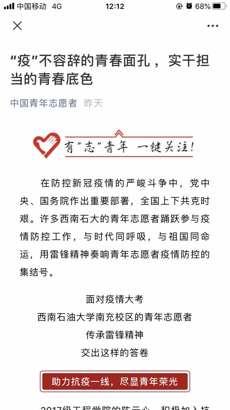 报道称,在防控新冠疫情的严峻斗争中,党中央、国务院作出重要部署,全国上下共克时艰。许多西南石大的青年志愿者踊跃参与疫情防控工作,与时代同呼吸,与祖国同命运,用雷锋精神奏响青年志愿者疫情防控的集结号。