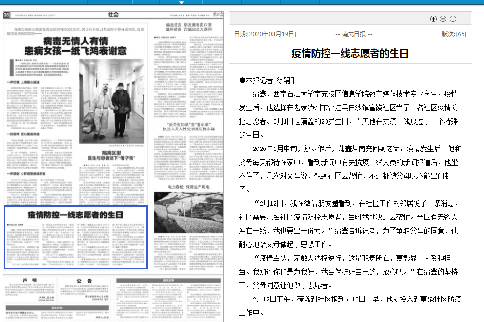 3月26日,南充日报以《疫情防控一线志愿者的生日》为题,重点报道了南充校区信息学院数字媒体技术专业学生蒲鑫参加家乡疫情防控志愿服务。