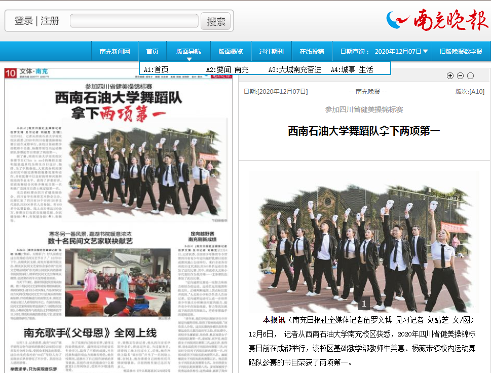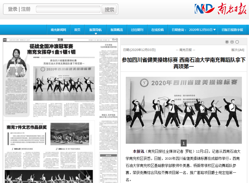 12月1日,南充日报在“文体”版以《参加四川省健美操锦标赛 西南石油大学南充舞蹈队拿下两项第一》为题,重点报道了校区基础教学部教师牛美惠、杨薇带领校区运动舞蹈队参赛,荣获街舞综合风格齐舞项目第一名、推广套路项目爵士规定组第一名。