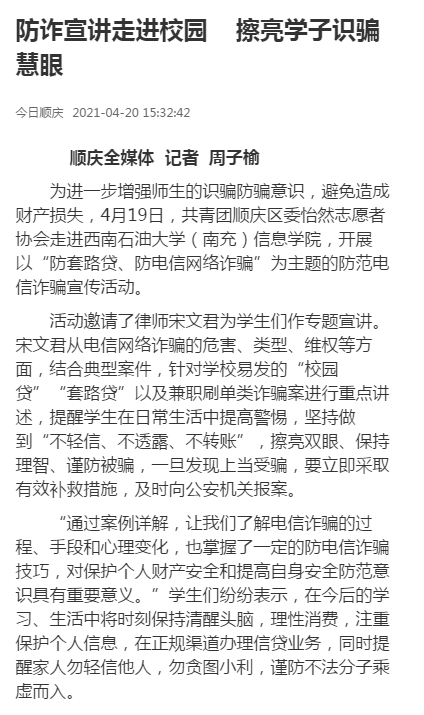 4月20日,顺庆区政府官方微信公众号“今日顺庆”以《防诈宣讲走进校园 擦亮学子识骗慧眼》为题,关注报道了信息学院防范电信诈骗宣传活动。
