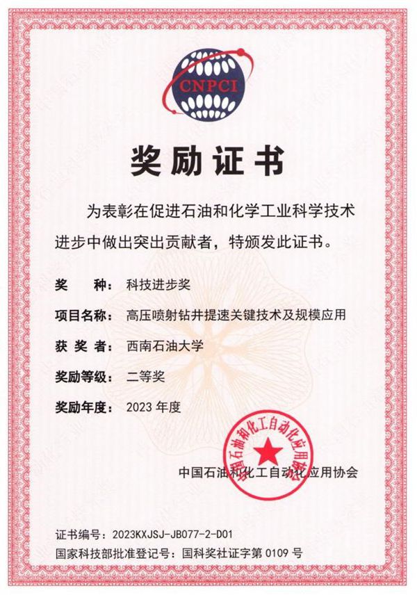 颁奖大会上,中国石油和化工自动化应用协会颁发了2023年度科学技术奖与专利奖,我校为第一完成单位、校区蔡灿为第一完成人的“高压喷射钻井提速关键技术及规模应用”项目荣获科技进步二等奖,杨显鹏、陈浩为项目共同完成人。