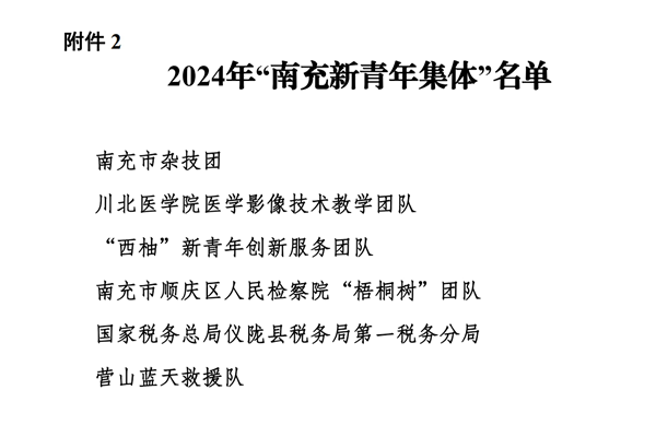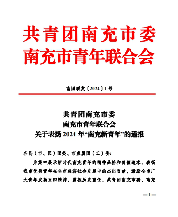 今年,共青团南充市委、南充市青年联合会授予8名同志2024年“南充新青年”称号、6个青年集体2024年“南充新青年集体”称号,旨在集中展示新时代南充青年的精神品格和价值追求,表扬南充市优秀青年在全市经济社会发展中的杰出贡献,激励全市广大青年发扬五四精神,勇担历史重任,营造学习先进、争当先进、赶超先进的良好氛围,号召全市各族青年青春心向党,建功新时代,不断创造无愧于时代和青春的新业绩,为建设“成渝第二城”,争创川东北经济副中心贡献青春力量