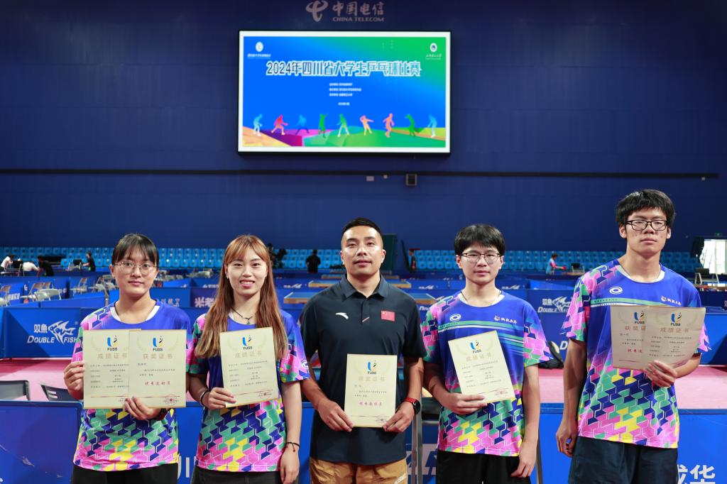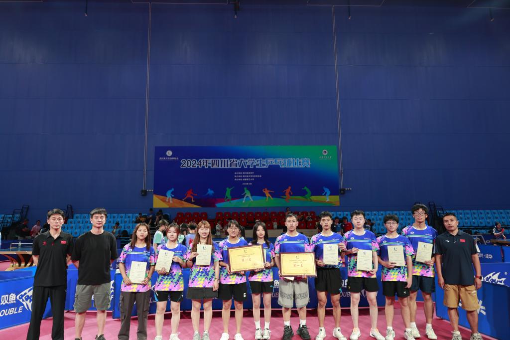 5月24日至26日,2024年四川省大学生乒乓球比赛在成都举行,教务部文化素质与公共基础课教学中心何俊老师指导土测院学生王媛、赖昱竹和成都校区学生组队参加女子团体比赛,荣获女子团体冠军;指导计科院学生李科、雷一和成都校区学生组队参加男子团体比赛,荣获男子团队冠军,我校获得体育道德风尚奖。