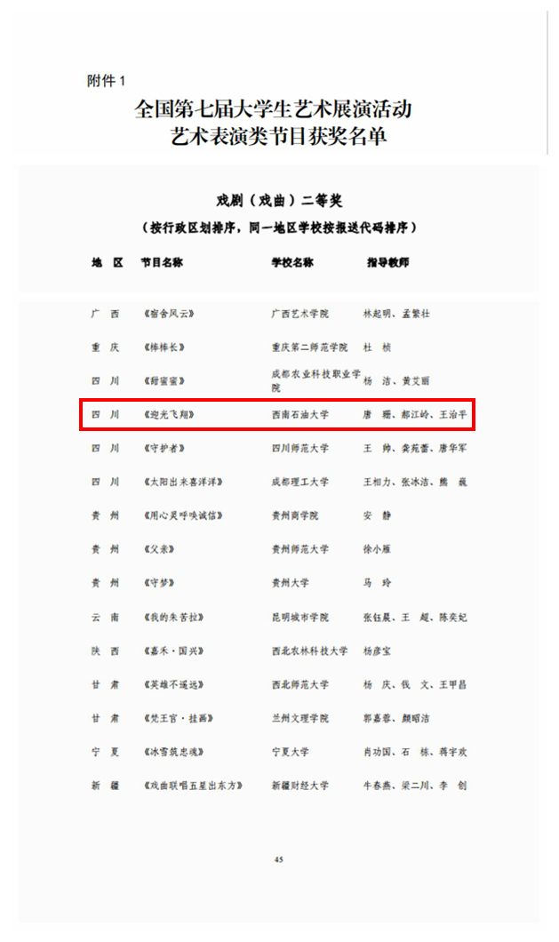 近日,由教育部主办的全国第七届大学生艺术展演活动获奖名单公布。南充校区组织创编的戏剧作品《迎光飞翔》荣获戏剧(戏曲)荣获全国二等奖,这不仅是南充校区参加全国大学生艺术展演获奖“零”的突破,也是我校参加全国大学生艺术展演以来取得的最好成绩,更是南充校区坚持以美育人、以美化人,以美培元,加强大学生美育教育取得的成效。