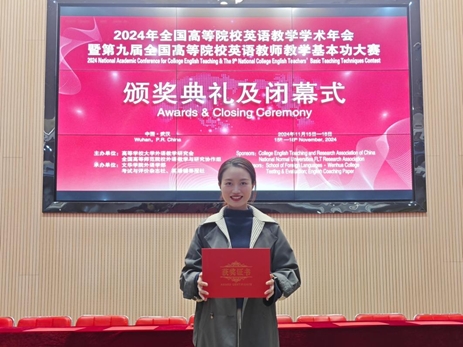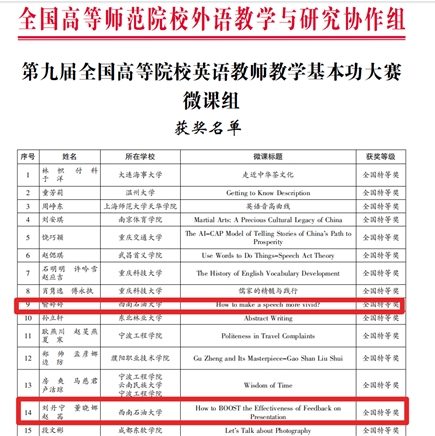 近日,第九届全国高等院校英语教师教学基本功大赛决赛圆满结束。教务部文化素质与公共基础课教学中心教师喻婷婷、刘丹宁均荣获“优秀课例评比·微课组”全国特等奖,王正奎荣获全国二等奖;柏宇荣获“优秀课例评比·说课组”全国一等奖、四川省特等奖,喻婷婷、董晓娜分别荣获四川省一等奖、二等奖;王正奎、冯娟、罗诗雨分别荣获“优秀课例评比·实录课组”四川省一、二、三等奖。