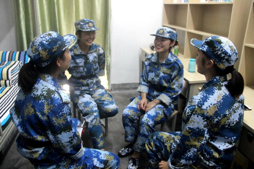 军训过程中,短暂的休息时间,让我们有机会与129寝室的同学一起聊天。与训练时的认真严肃不同,这时候的四个女孩子,活泼俏皮,微笑中透露着坚强与自信,充满了朝气和活力。