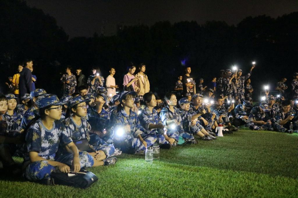 一天的军训生活结束,学院组织了慰问活动。同学们坐在草坪上,打开了手电筒,倚靠着彼此,随着飘扬的歌声,轻轻摇晃着手中的“星光”,往日里严肃的训练场成了一片光的海洋。或许是临近中秋,月亮格外的圆。是夜,给了军训不一样的颜色。