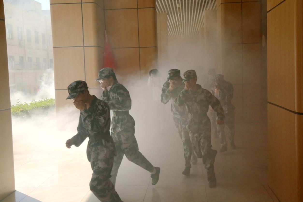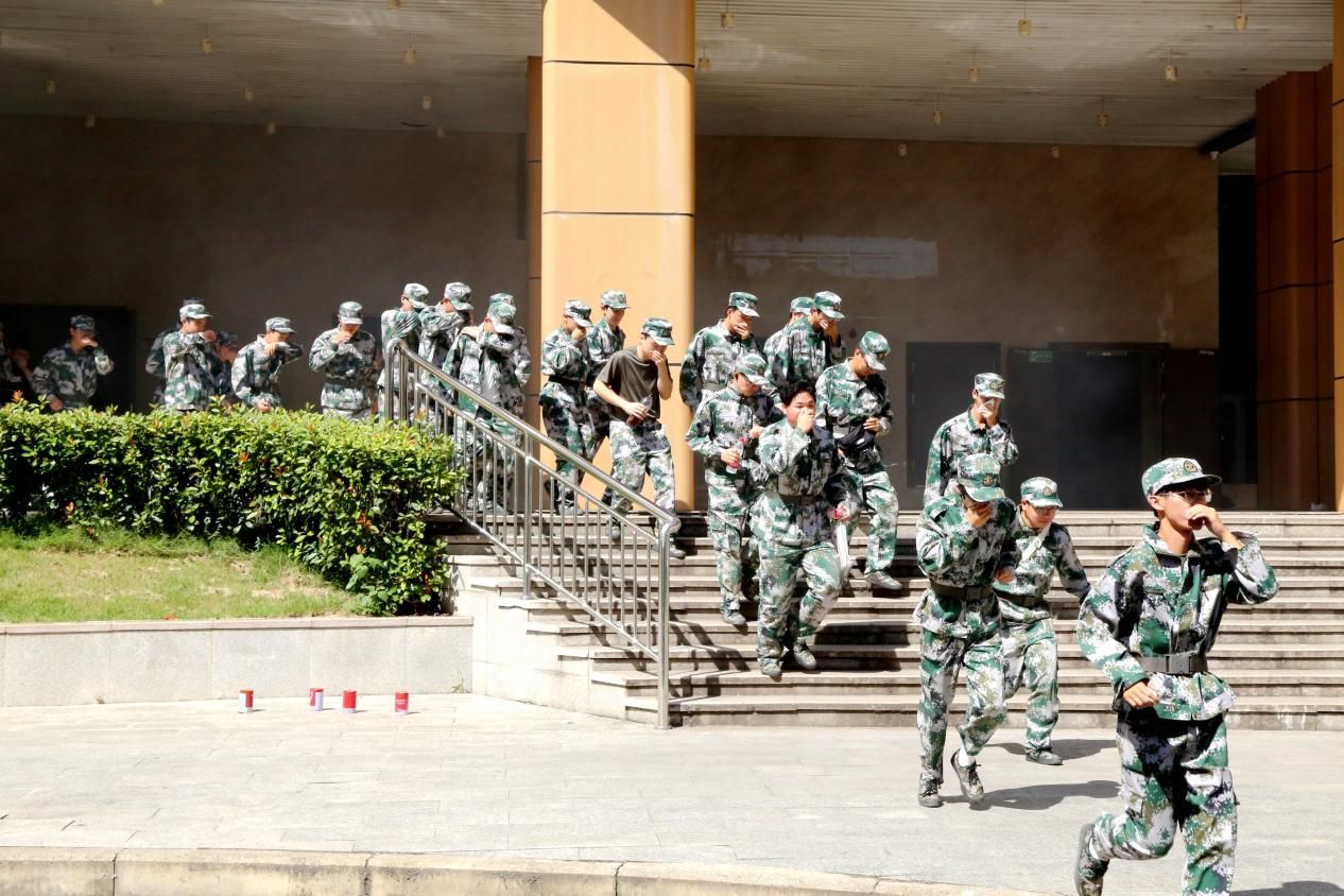 14时20分,随着急促的哨声响起,模拟的“火情”在新生宿舍楼下发生,烟雾迅速蔓延。各楼层疏散引导员与军训教官立即响应,组织学生沿预定路线迅速、有序撤离。同学们遮掩口鼻、低头弯腰,护住头部,扶稳楼梯扶手,迅速从安全通道疏散撤离,全程冷静、行为规范。撤离至安全区域后,全体学生在田径场指定位置集合。各连队及时清点人数,确认全体人员安全撤离。经确认,演练过程中无人员受伤,整体疏散高效有序。