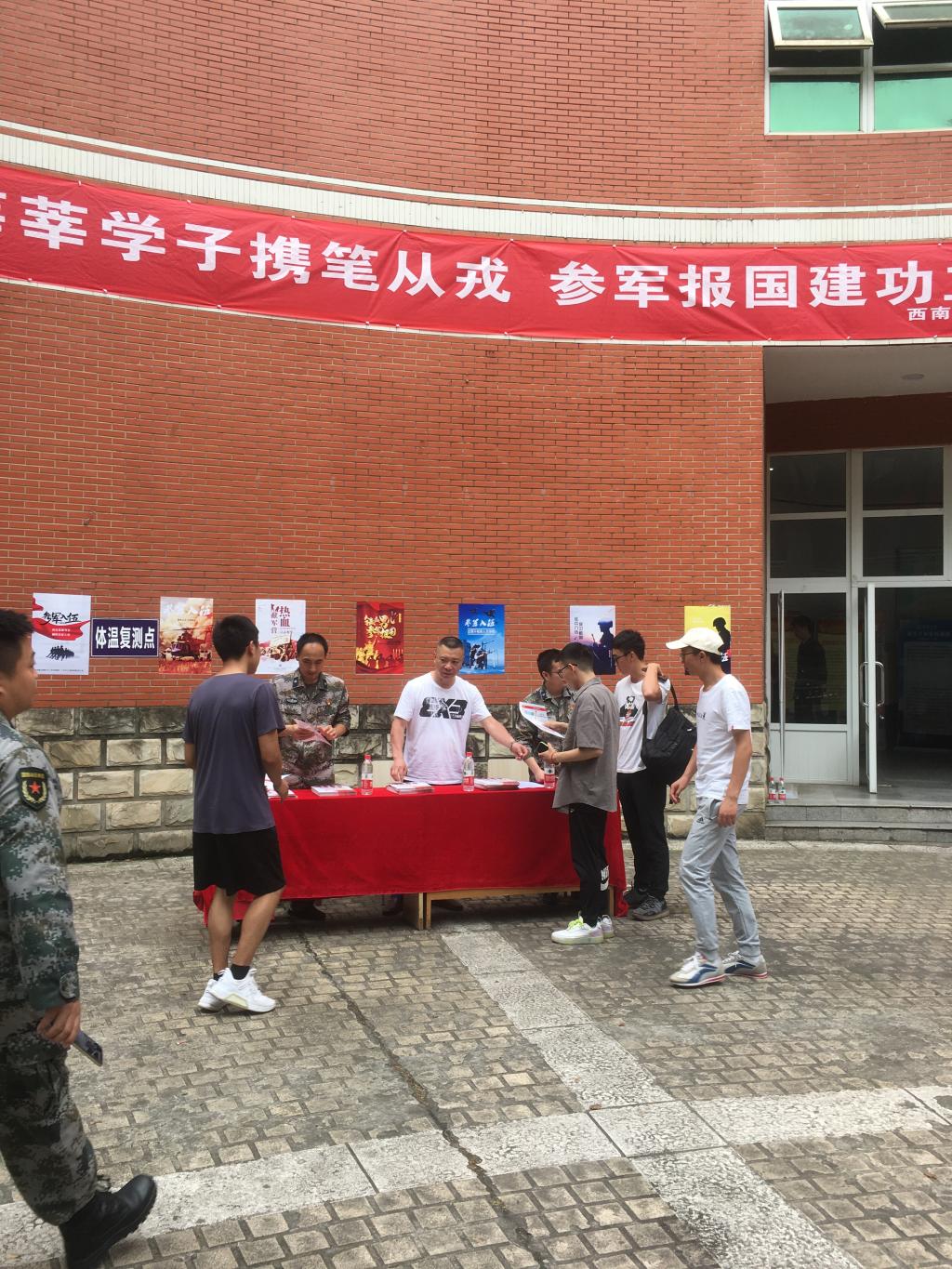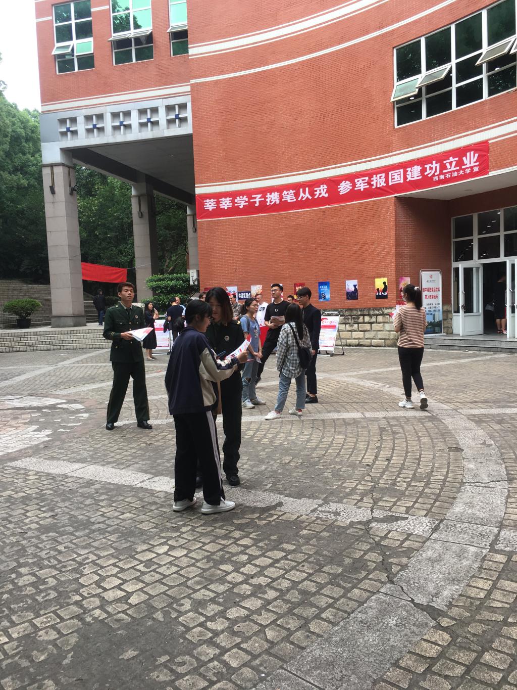 活动期间在第四教学楼、外语村等地点向大学生讲解了入伍流程和政策、解读了部队生活和军人待遇,同时并发放了征兵宣传单1500余份。顺庆区人民武装部表示将积极配合学校,对大学生入伍开展体检、政审绿色通道,确保让有意愿入伍的大学生都能顺利通过,鼓励大学生积极投身军营,报效祖国。(何睿)