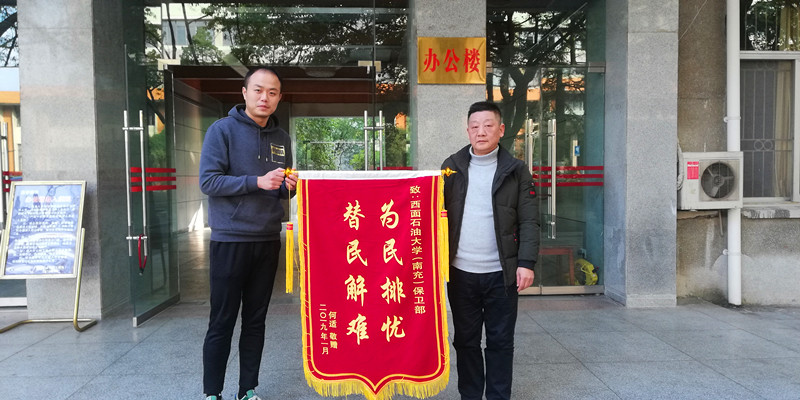 “太感谢你们了,要不是你们的帮助,我的金项链就真丢了。”1月5日下午,群众何某将一面印有“为民排忧、替民解难”的锦旗送到保卫部治安科工作人员手中,感谢工作人员帮其找回遗失物品。