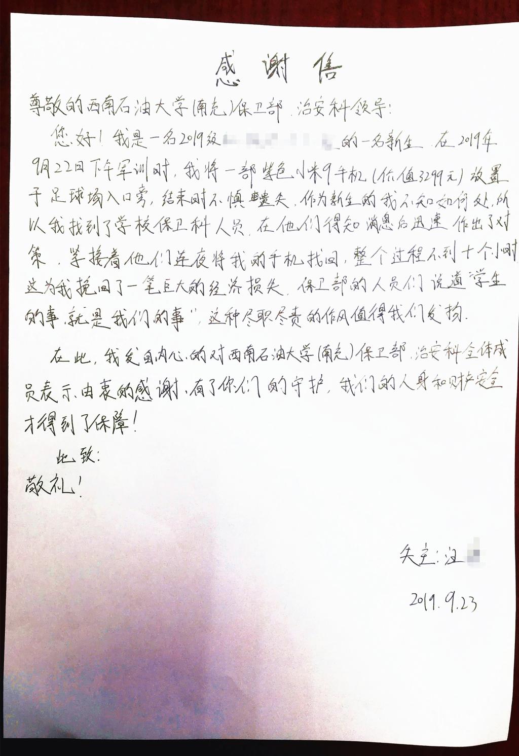 9月23日,2019级学生汪某将一封感谢信送到保卫部治安科工作人员手中,对工作人员热情服务帮其找回遗失手机表示衷心的感谢。治安科长蒲和平接待了来访学生。