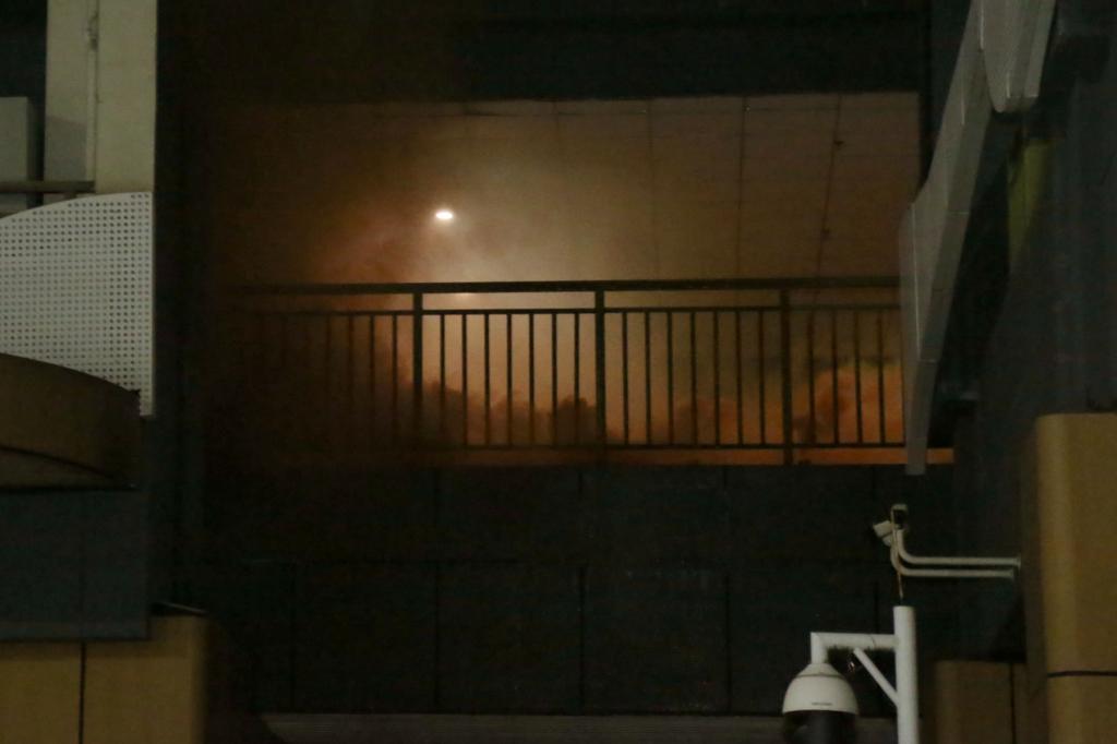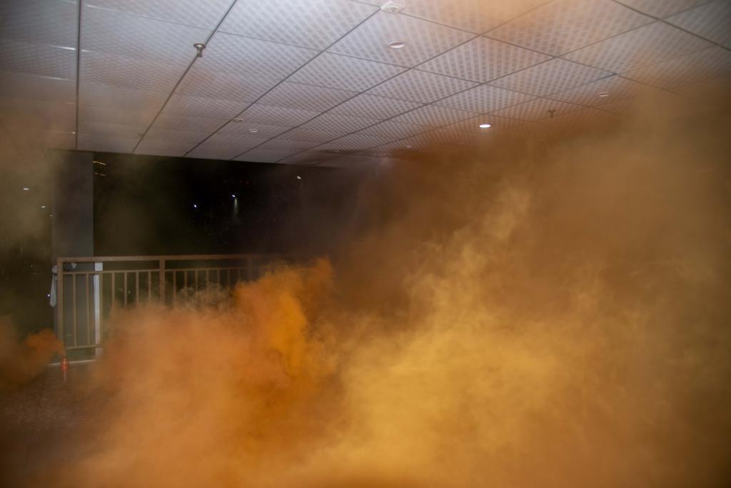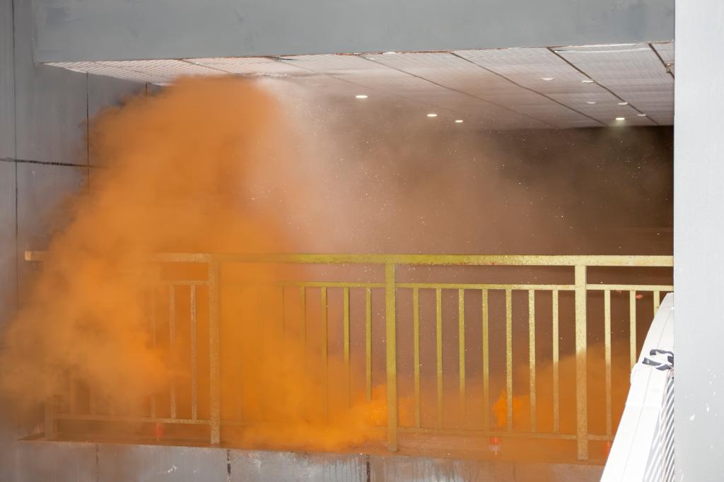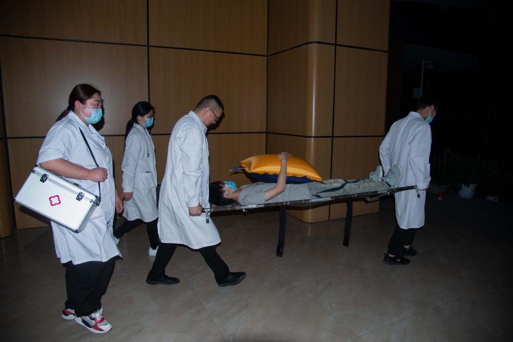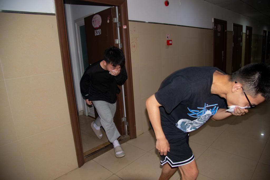学生电梯公寓2层B区和C区交界处平台由于堆放较多杂物,不慎引发火灾,浓烟弥漫整个楼道并向四周快速扩散,火势迅速蔓延触发了楼内喷淋系统、报警系统和消防广播等系统。楼内学生听到消防报警声音后,按照疏散引导员指示,使用湿毛巾遮掩口鼻迅速从安全通道疏散撤离,沿指定逃生路线有序撤离至田径运动场。经过在场志愿者及学院班级负责人清点人数后,确认全体人员安全撤离,至此本次消防演练圆满结束。此次消防应急疏散演练还模拟了伤员救治场景。