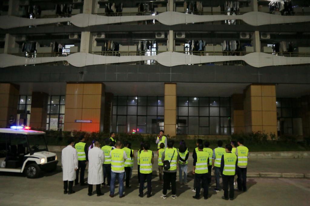 南充校区高层学生公寓分A、B、C三个区,最高18层,3600张床位,每个区安装3部电梯,是学校重点消防部位。本次演练采用模拟真实火警模式进行,是学校首次在夜间开展消防应急疏散演练,也是首次将高层学生公寓作为消防应急疏散演练地点。