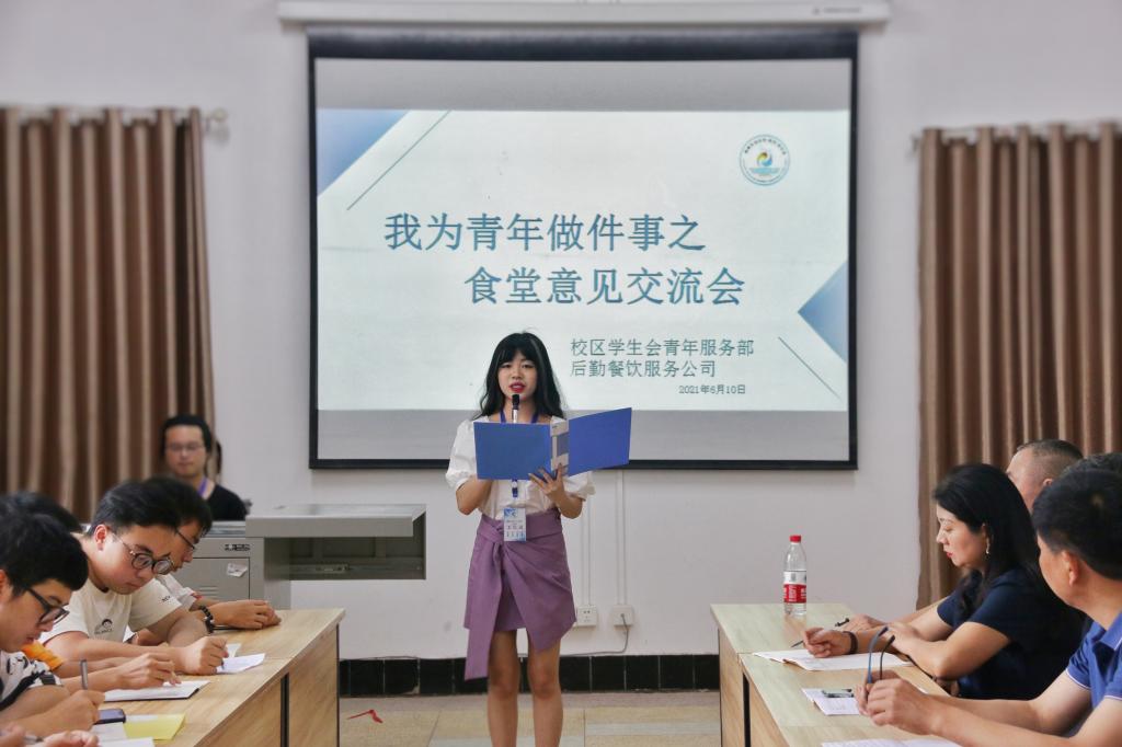 为加强校区学子与食堂后勤餐饮服务公司的交流,共创美好和谐食堂环境,6月10日,校区学生会青年服务部联合后勤餐饮服务公司于外语村宣讲室共同开展“我为青年做件事——食堂意见交流座谈会”活动。