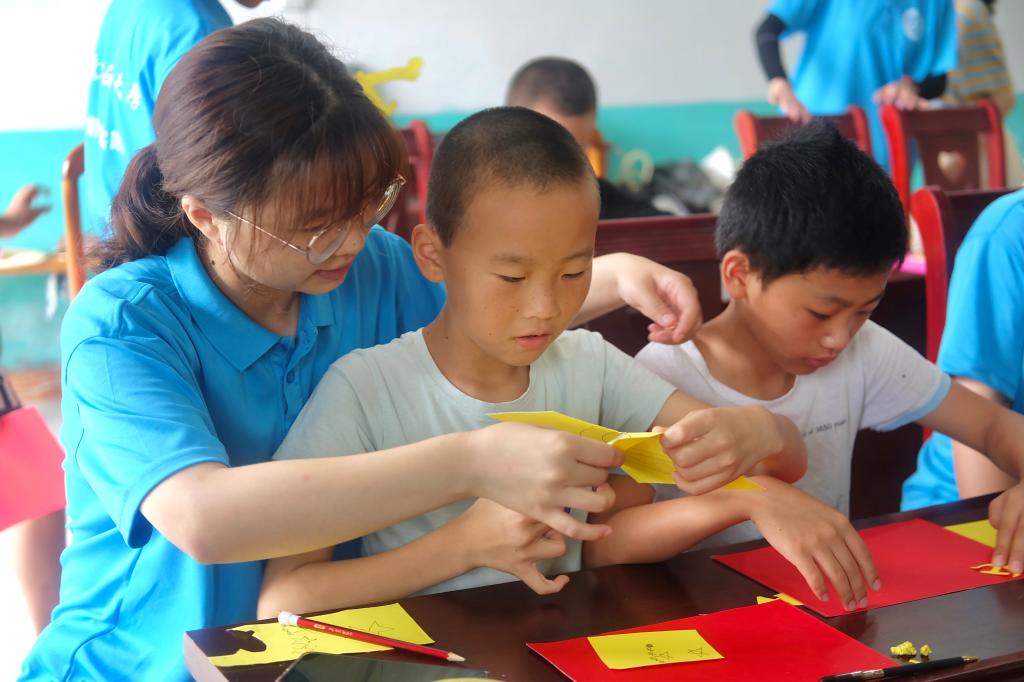 队员带领小朋友们制作党旗